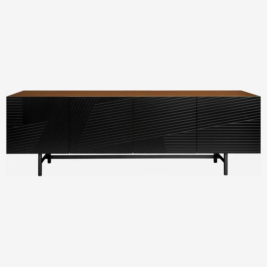Le buffet bas 4 portes Eskyss séduit par sa combinaison de matériaux nobles. Le bois de noyer se mélange subtilement avec un bois laqué noir très élégant. Ce meuble de rangement est aussi parfait comme meuble TV.