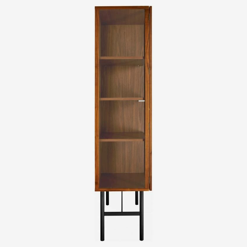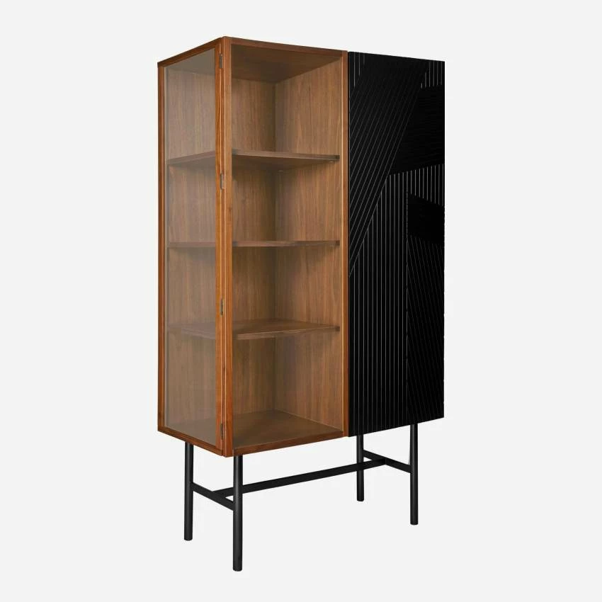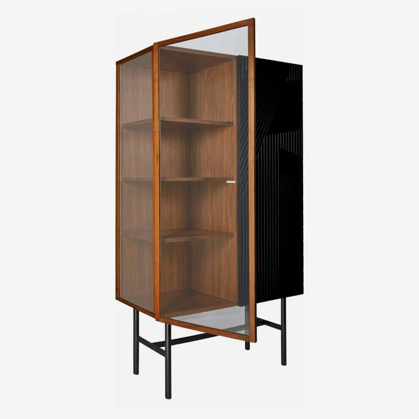 Le buffet haut Eskyss en noyer et bois laqué noir possède une partie vitrine et une partie bibliothèque. La porte de gauche vitrée permet un libre accès à 3 tablettes afin d’exposer ou ranger librement vos livres, vos plus belles vaisselles ou vos objets décoratifs. La porte de droite est conçue comme un tableau monochrome d’art contemporain. Le design aux lignes graphiques joue subtilement avec la lumière et les ombres créées par le revêtement noir texturé de la façade.