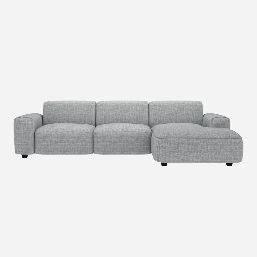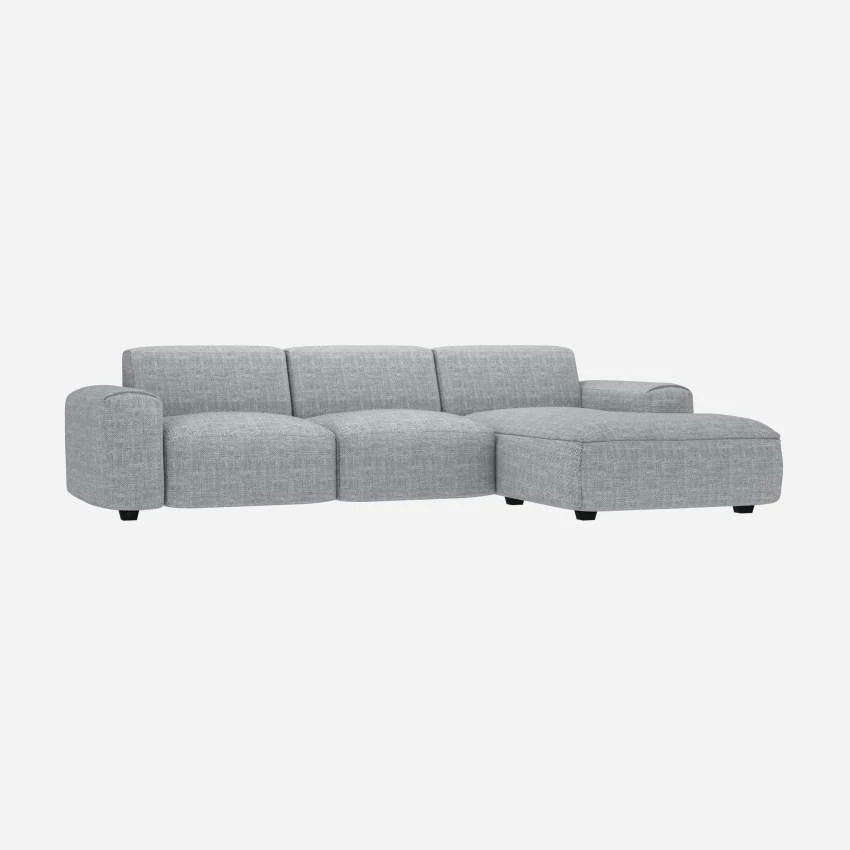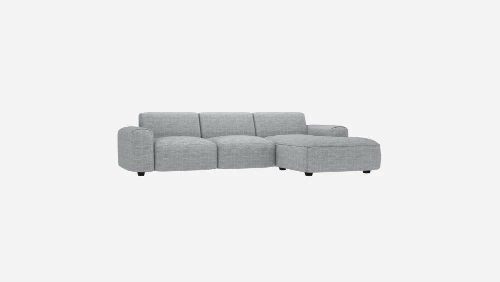 Le canapé 3 places Posada avec méridienne droite en tissu Melina gris asphalte est un canapé d’une grande élégance. Son design soigné se retrouve dans ses coutures et les finitions en ourlet de ses accoudoirs.