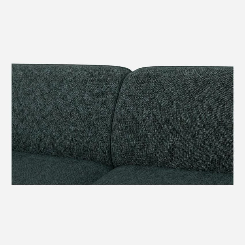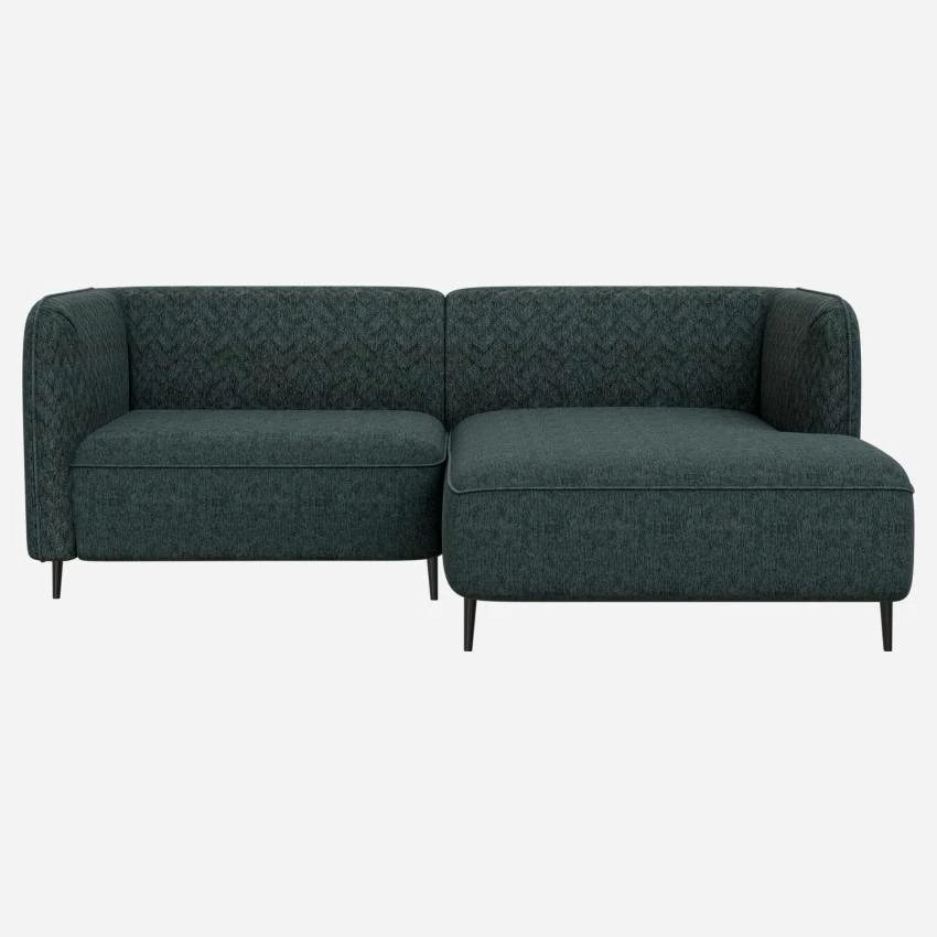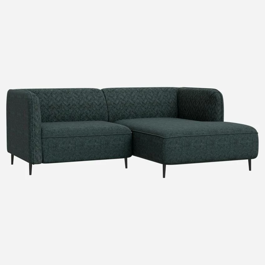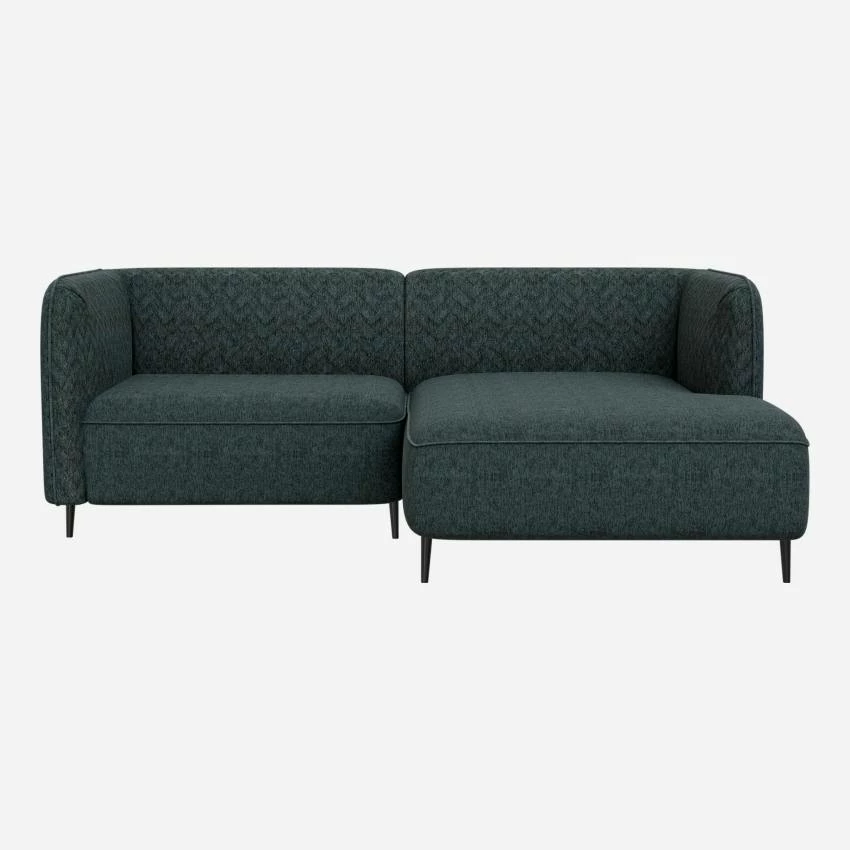 Le canapé d’angle droit Tedd en tissu bleu se compose d’une chauffeuse de 1,5 place et d’une large méridienne. Avec ses dimensions compactes, il est idéal pour les personnes rêvant d’un canapé d’angle mais ayant peu de place. Design, il offre aussi un effet bi-matière. Son dossier et ses accoudoirs alignés à la même hauteur sont piqués en chevron, contrastant ainsi avec le revêtement d’assise laissé vierge de coutures décoratives. Ce motif texturé et matelassé apporte également de l’originalité et du raffinement à l’ensemble et vous invite à prendre place sur les larges coussins d’assise.