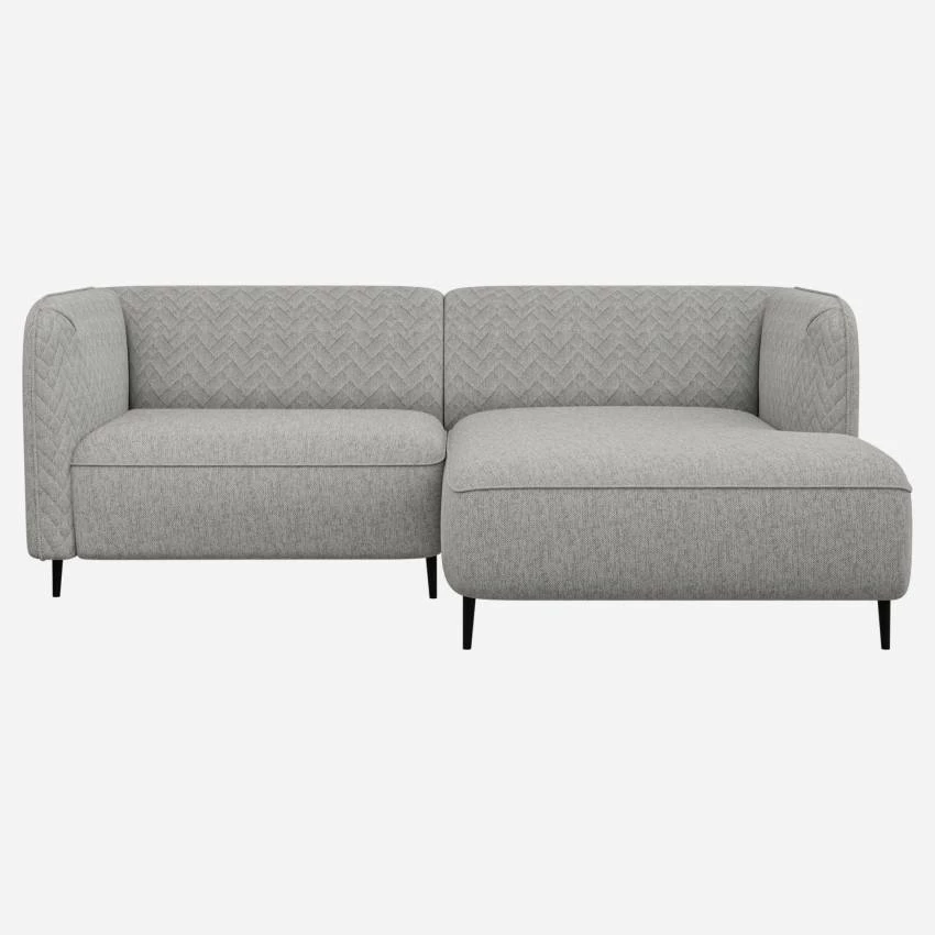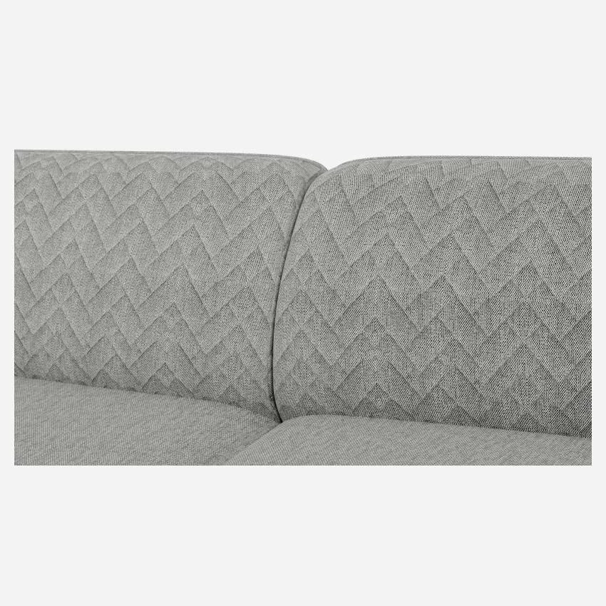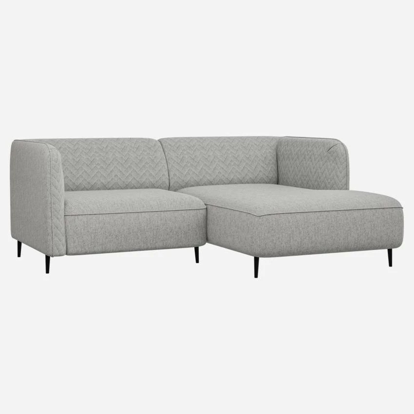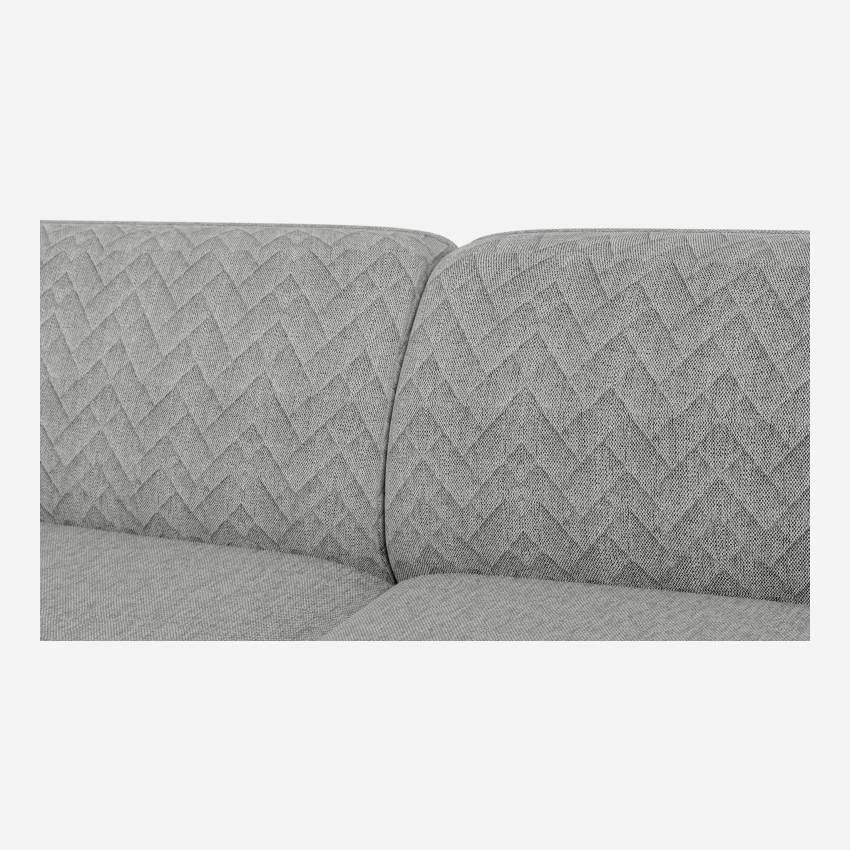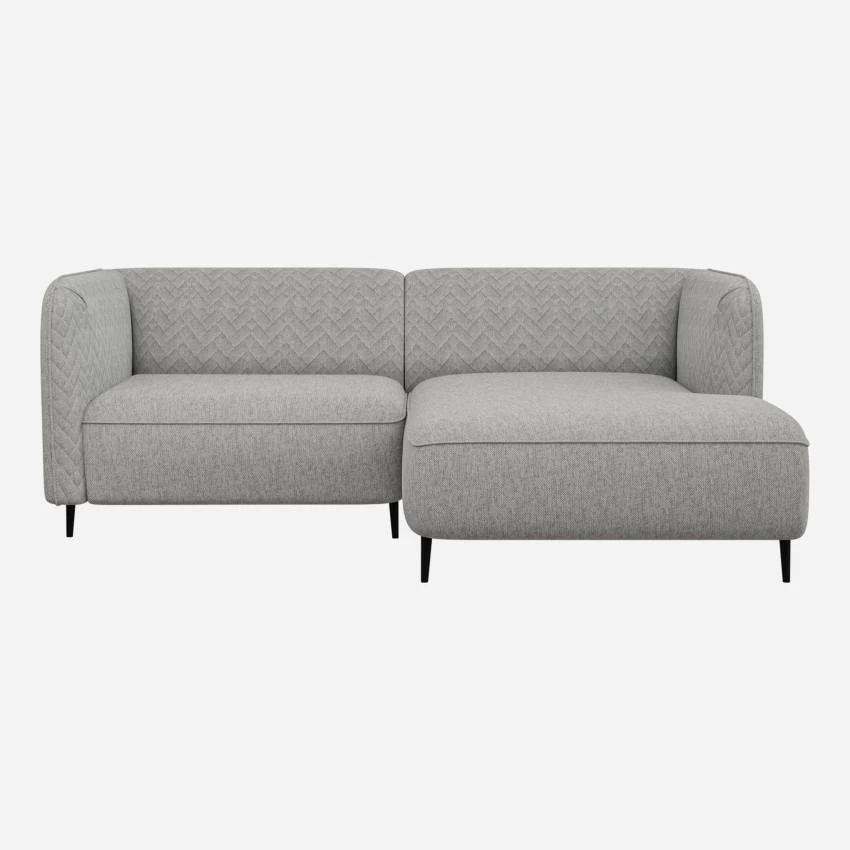 Le canapé d’angle droit Tedd en tissu gris se compose d’une chauffeuse de 1,5 place et d’une large méridienne. Avec ses dimensions compactes, il est idéal pour les personnes rêvant d’un canapé d’angle mais ayant peu de place. Design, il offre aussi un effet bi-matière. Son dossier et ses accoudoirs alignés à la même hauteur sont piqués en chevron, contrastant ainsi avec le revêtement d’assise laissé vierge de coutures décoratives. Ce motif texturé et matelassé apporte également de l’originalité et du raffinement à l’ensemble et vous invite à prendre place sur les larges coussins d’assise.
