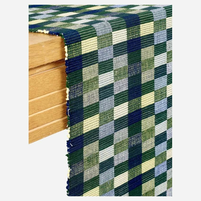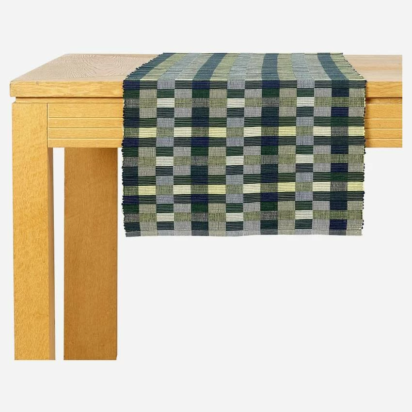 Le chemin de table Otman est en 100% coton. De dominante verte, son motif se compose de lignes et de rectangles imbriqués.