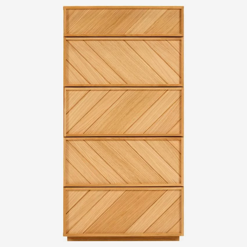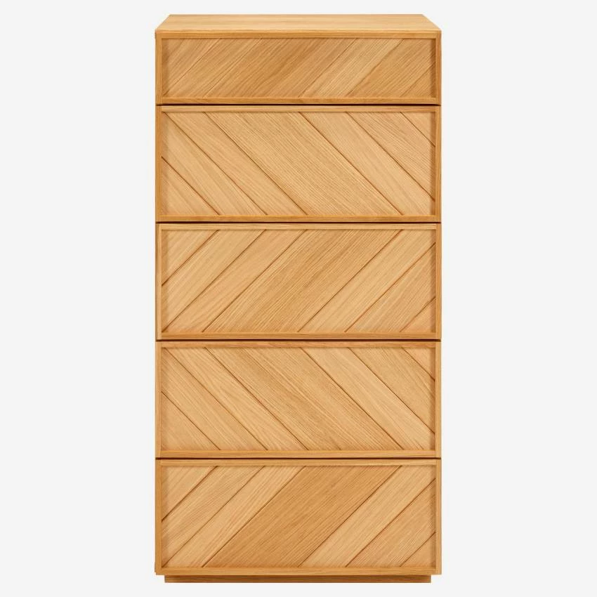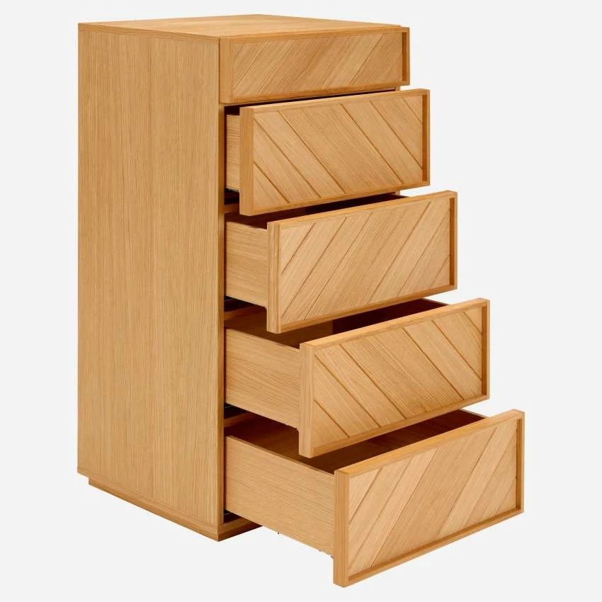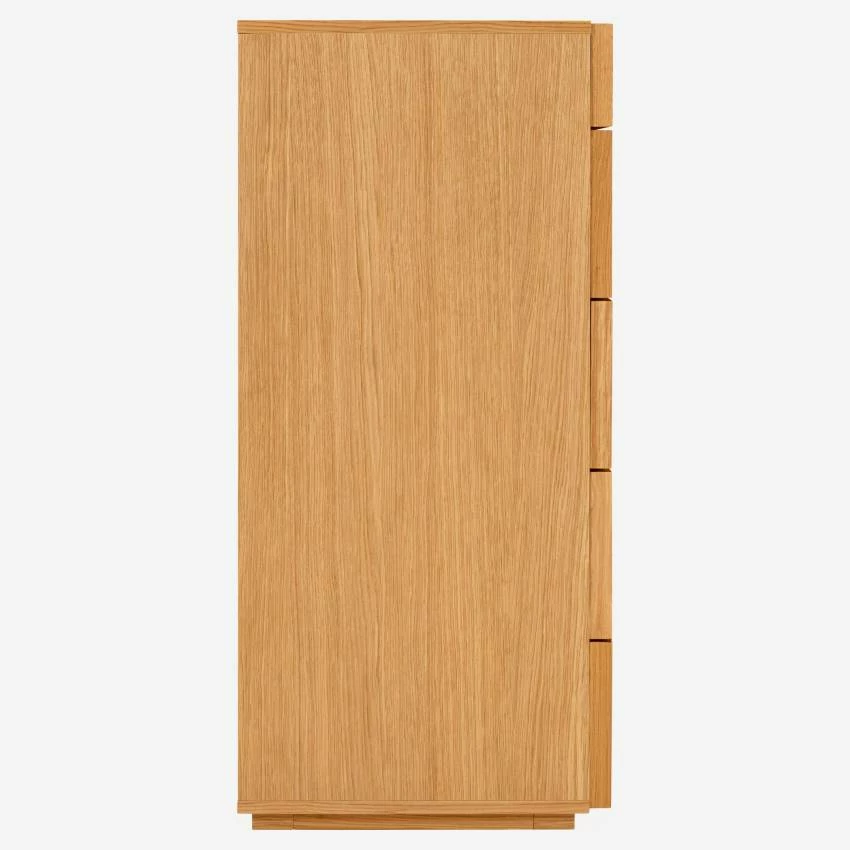 Le chiffonnier Madeleine en chêne possède cinq tiroirs. Aussi design que fonctionnel, il trouve parfaitement sa place dans une chambre à coucher ou une entrée.