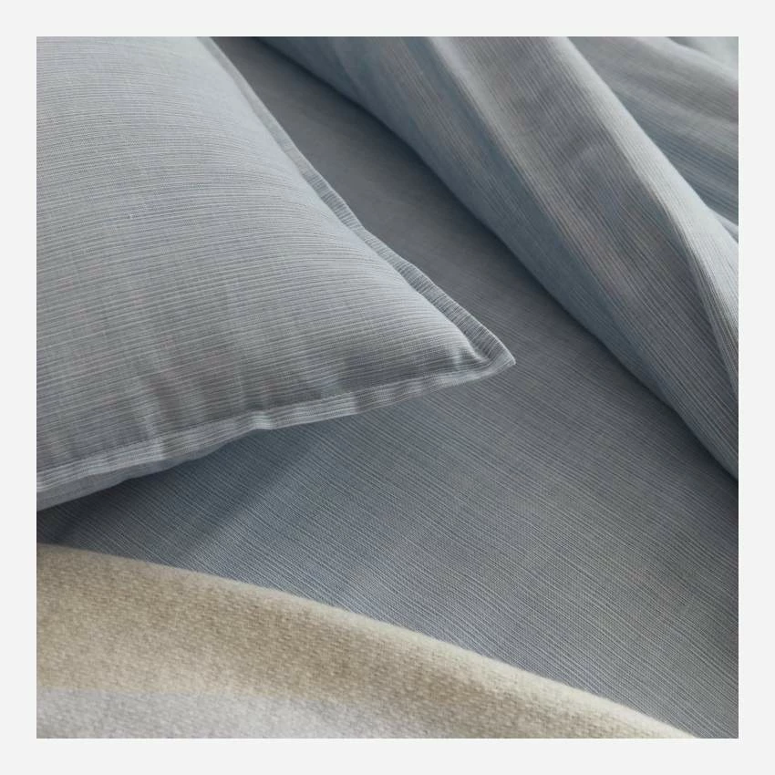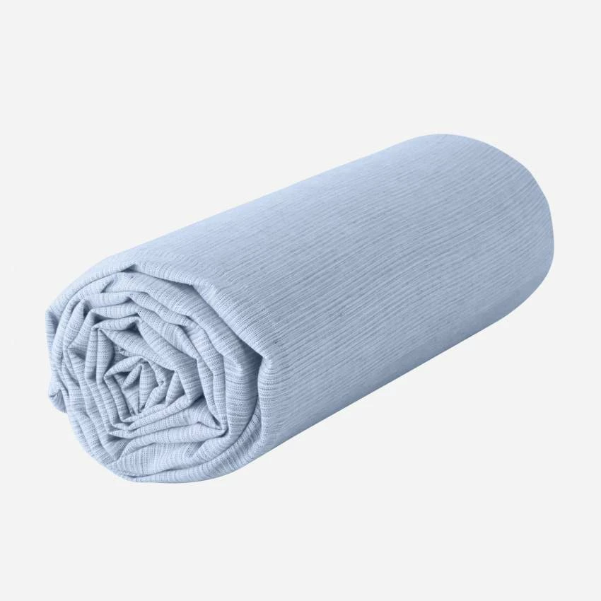 Le drap housse Skye en coton est compatible avec les matelas de 160 x 200 cm. De couleur bleu ciel, il se compose de fils de différentes nuances.