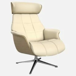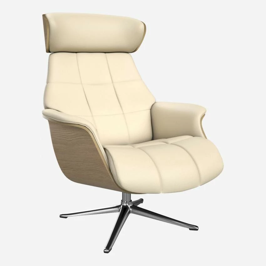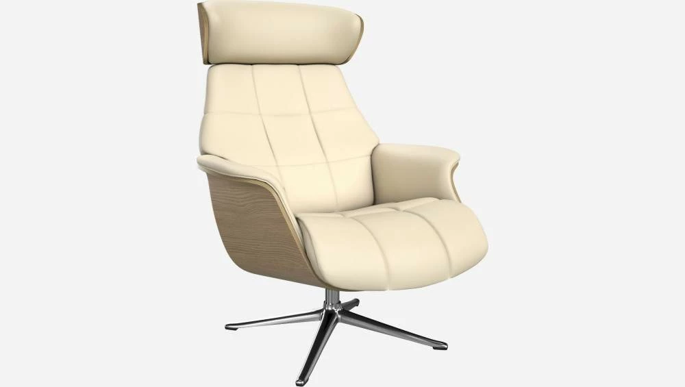 Le fauteuil Marc en chêne et cuir Savoy blanc albâtre avec pied aluminium offre un confort ultime, grâce à son dossier inclinable et à sa têtière ajustable en hauteur.