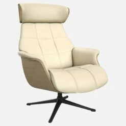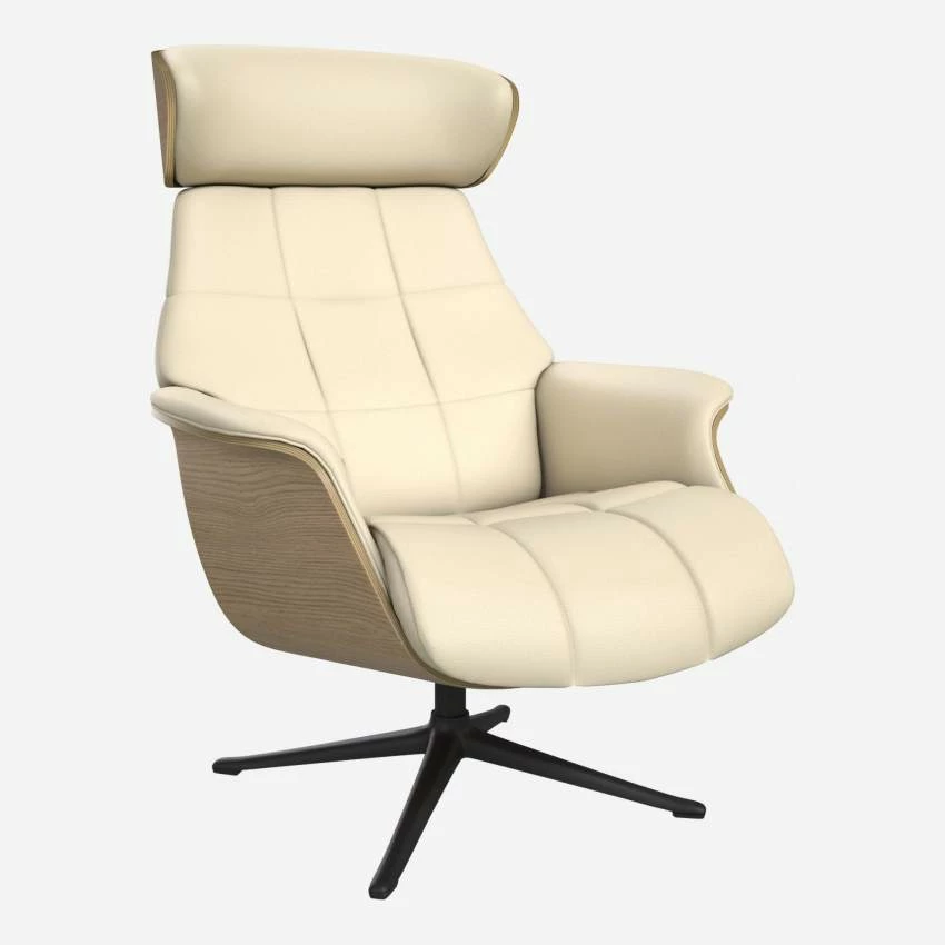 Le fauteuil Marc en chêne et cuir Savoy blanc albâtre avec pied noir offre un confort ultime, grâce à son dossier inclinable et à sa têtière ajustable en hauteur.