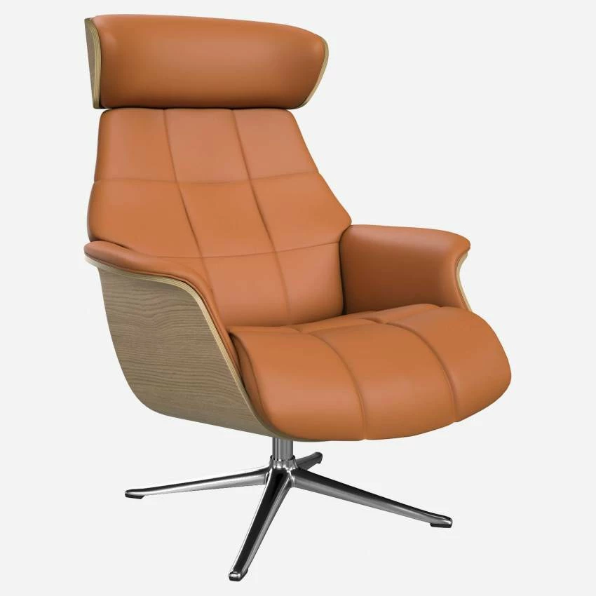 Le fauteuil Marc en chêne et cuir Savoy marron cognac avec pied aluminium offre un confort ultime, grâce à son dossier inclinable et à sa têtière ajustable en hauteur.