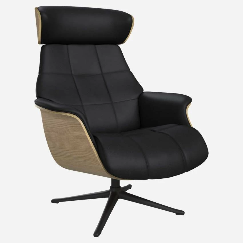 Le fauteuil Marc en chêne et cuir Savoy noir obsidienne avec pied noir offre un confort ultime, grâce à son dossier inclinable et à sa têtière ajustable en hauteur.