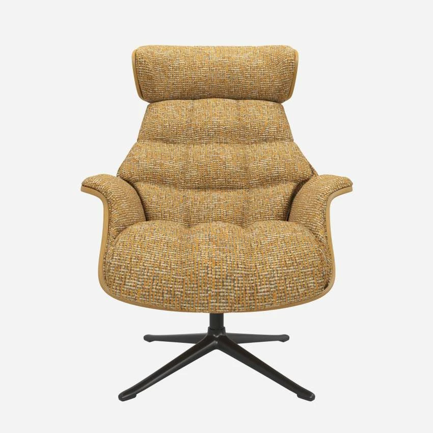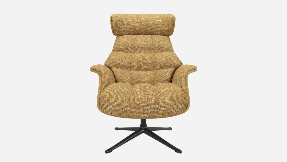 Le fauteuil Marc en chêne et tissu Alba jaune soleil avec pied noir offre un confort ultime, grâce à son dossier inclinable et à sa têtière ajustable en hauteur.