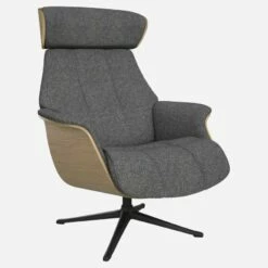 Le fauteuil Marc en chêne et tissu Bellagio bleu céleste avec pied noir offre un confort ultime, grâce à son dossier inclinable et à sa têtière ajustable en hauteur.