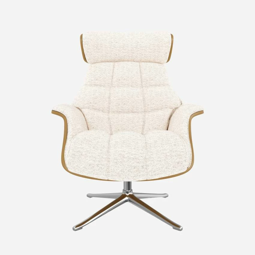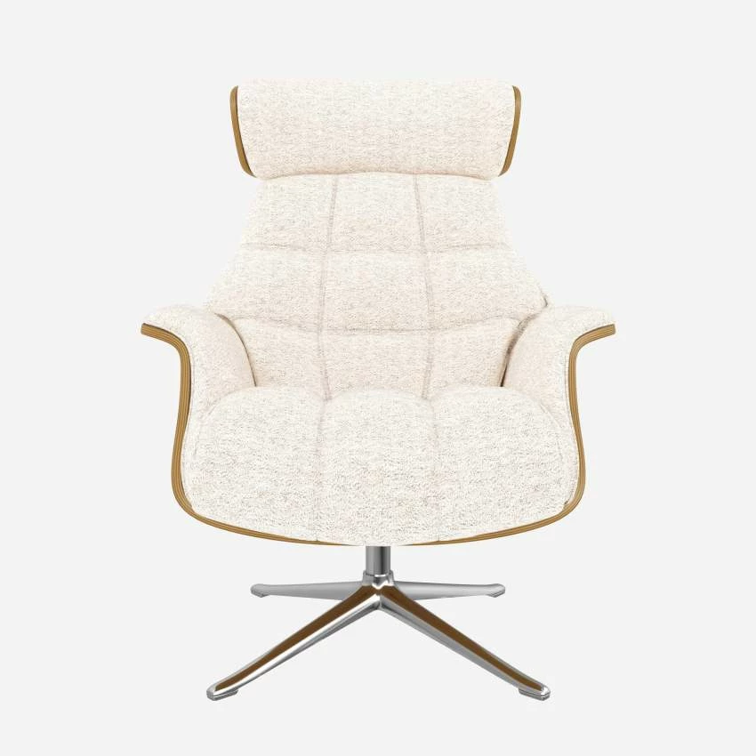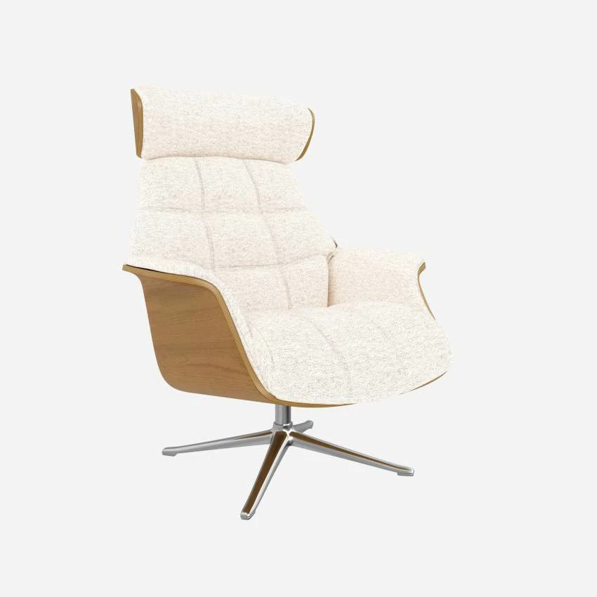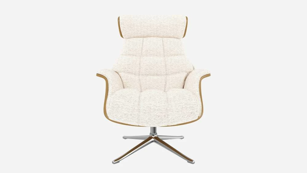 Le fauteuil Marc en chêne et tissu Bormio blanc albâtre avec pied aluminium offre un confort ultime, grâce à son dossier inclinable et à sa têtière ajustable en hauteur.