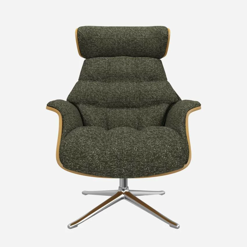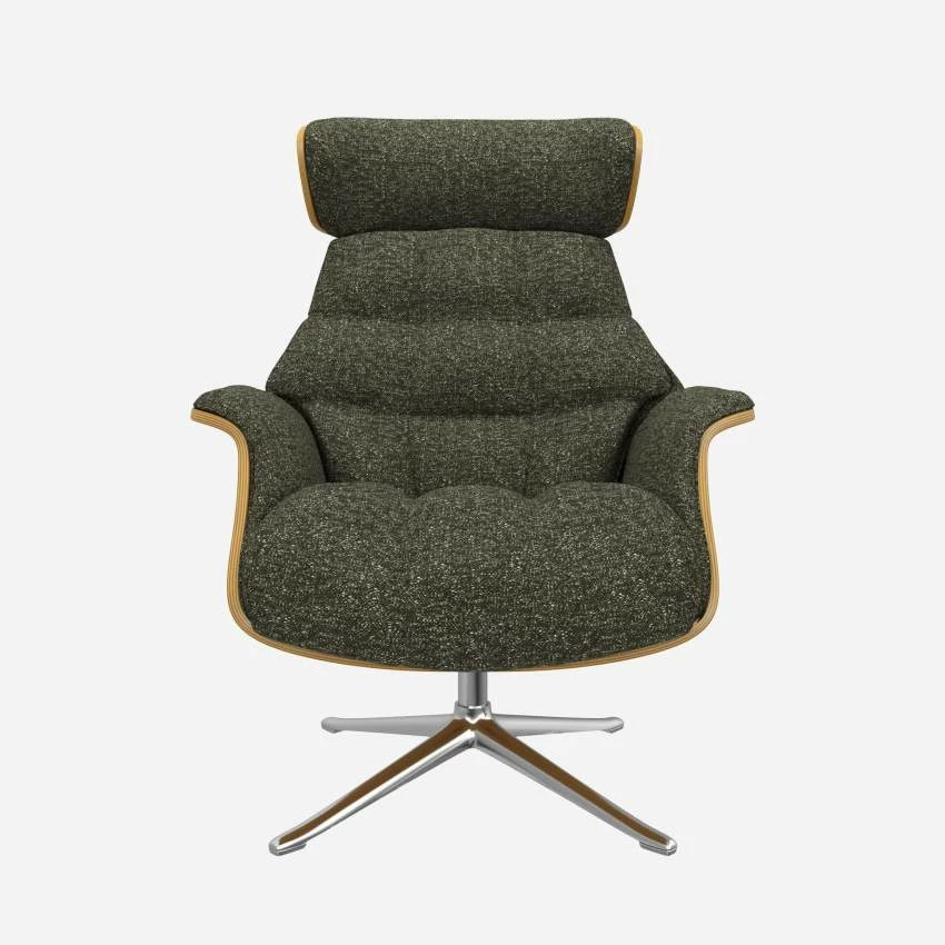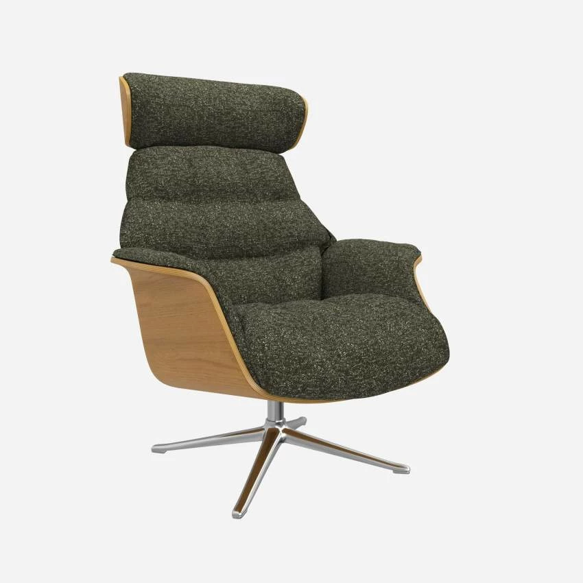 Le fauteuil Marc en chêne et tissu Lucca vert mousse avec pied aluminium offre un confort ultime, grâce à son dossier inclinable et à sa têtière ajustable en hauteur.