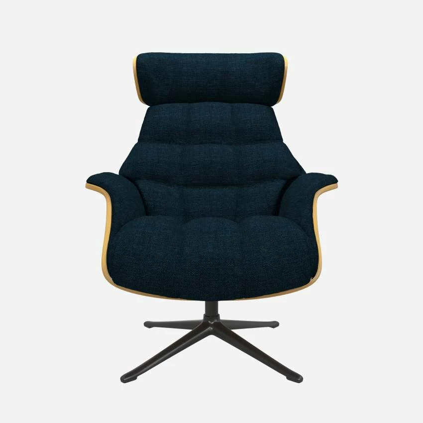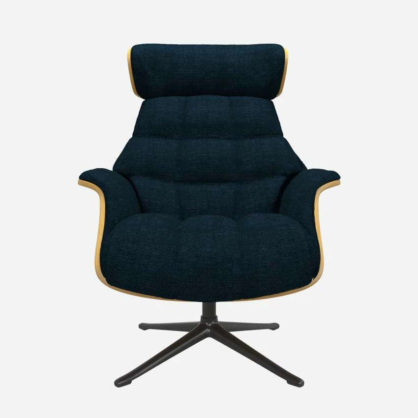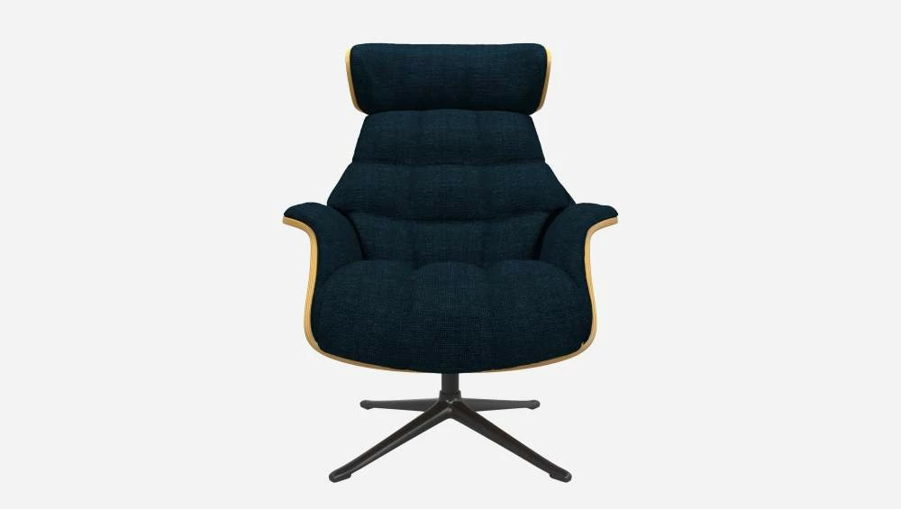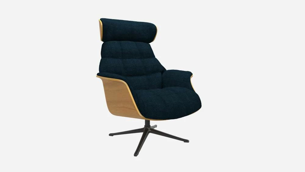 Le fauteuil Marc en chêne et tissu Melina bleu encre avec pied noir offre un confort ultime, grâce à son dossier inclinable et à sa têtière ajustable en hauteur.