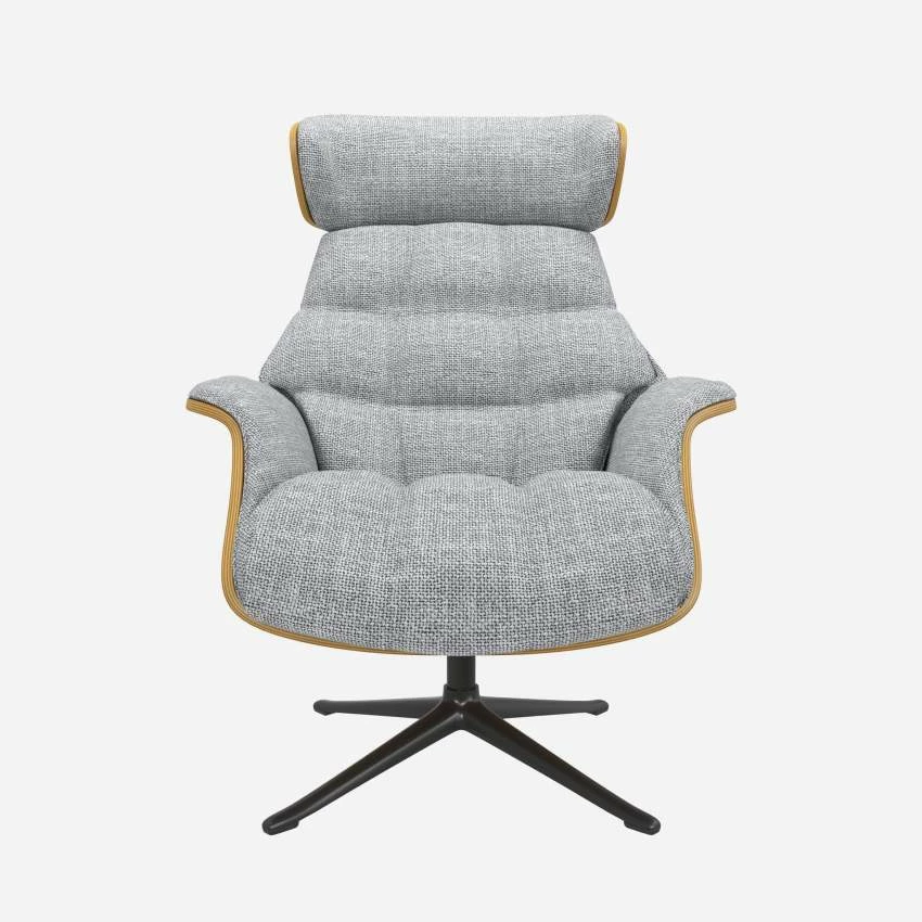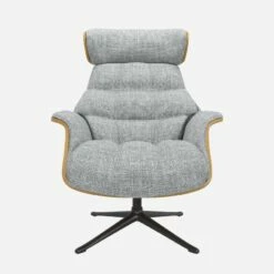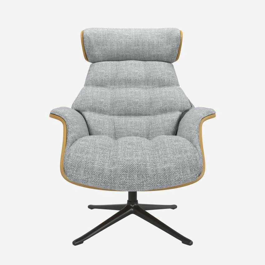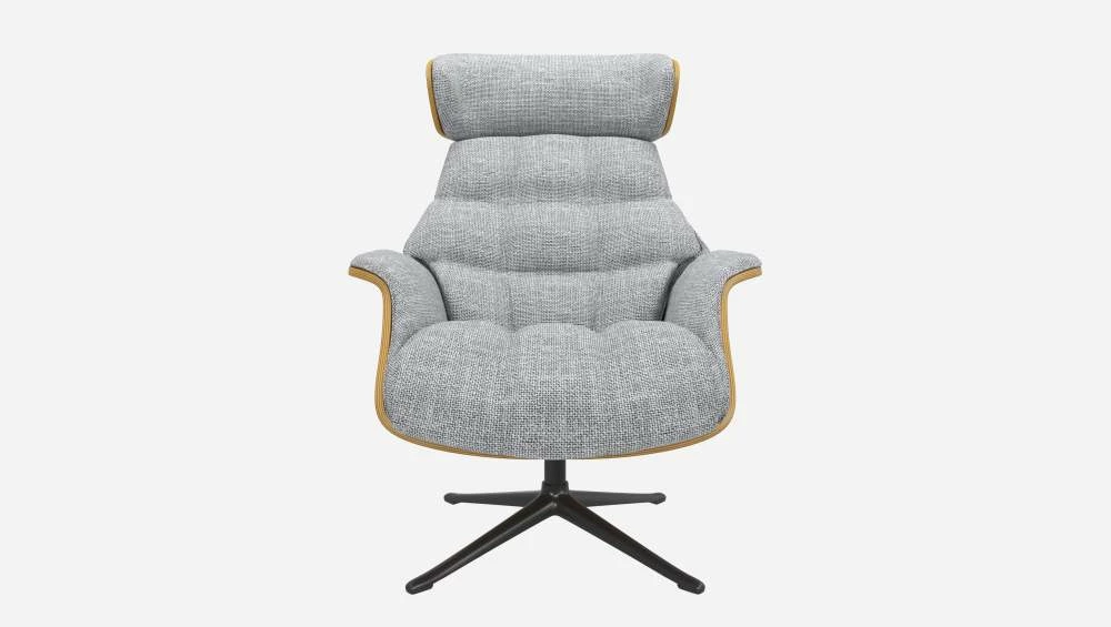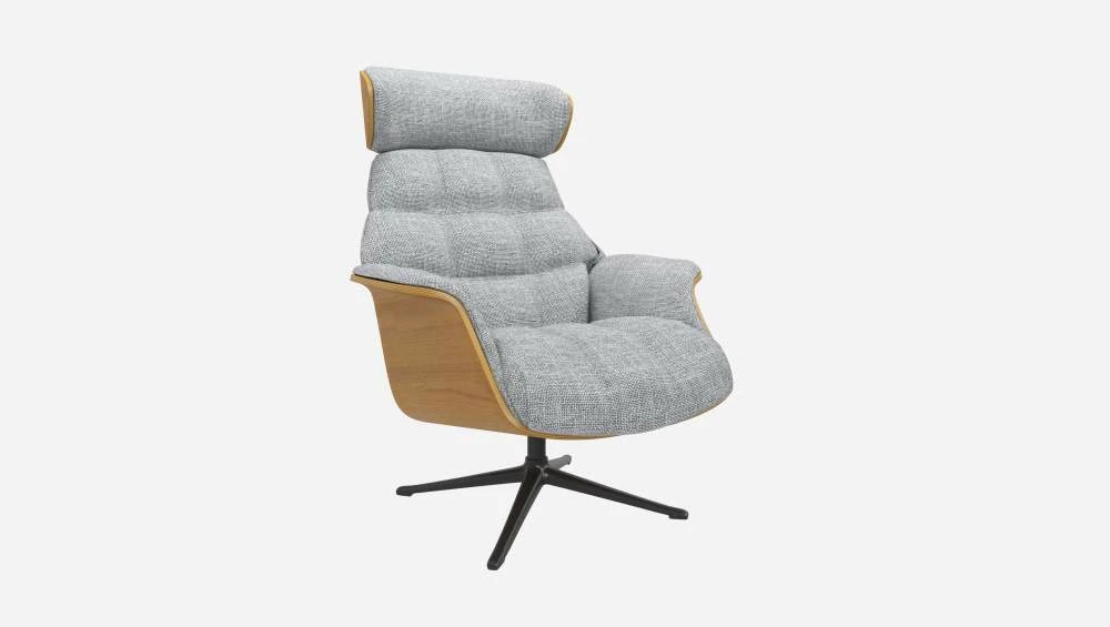 Le fauteuil Marc en chêne et tissu Melina gris asphalte avec pied noir offre un confort ultime, grâce à son dossier inclinable et à sa têtière ajustable en hauteur.