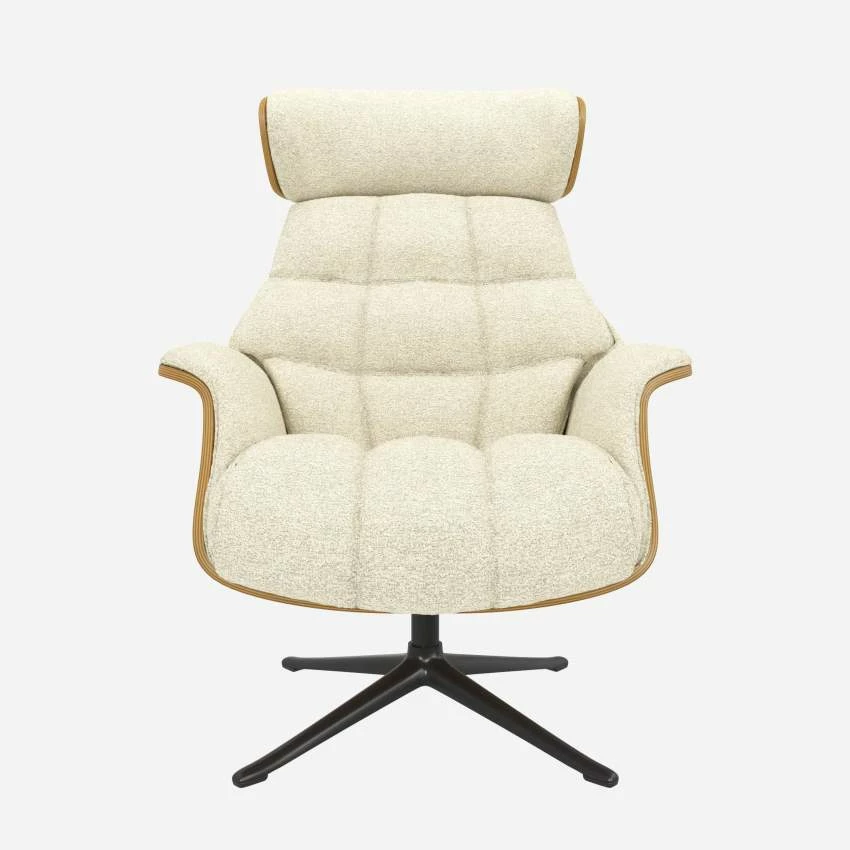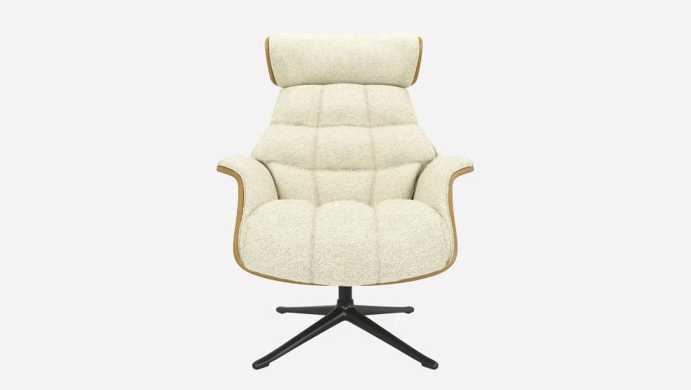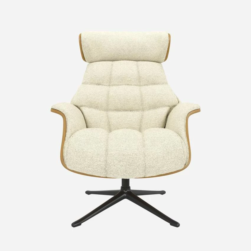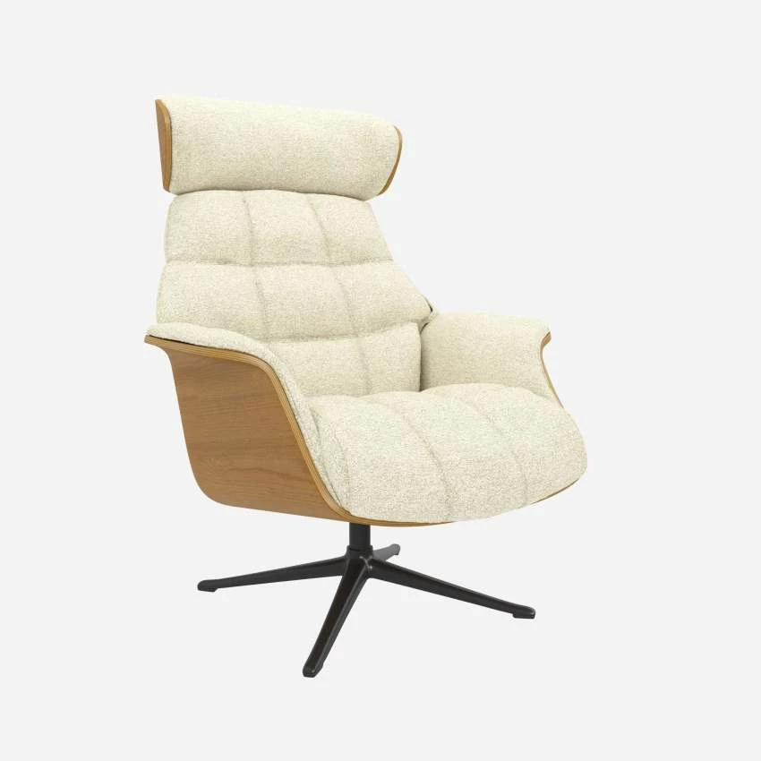 Le fauteuil Marc en chêne et tissu Venezia blanc craie avec pied noir offre un confort ultime, grâce à son dossier inclinable et à sa têtière ajustable en hauteur.