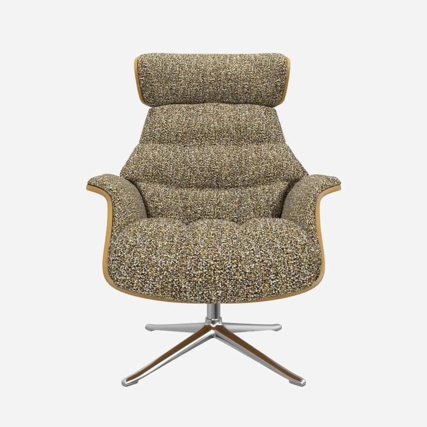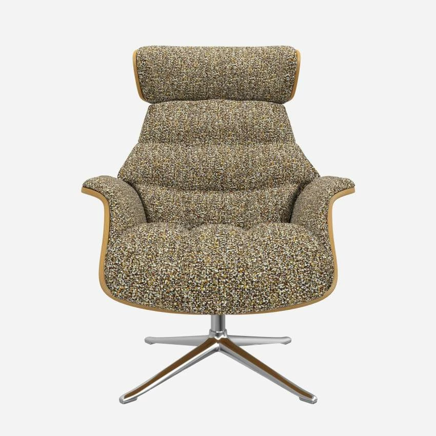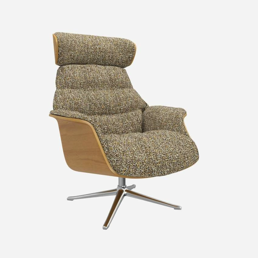 Le fauteuil Marc en chêne et tissu Venezia vert lichen avec pied aluminium offre un confort ultime, grâce à son dossier inclinable et à sa têtière ajustable en hauteur.