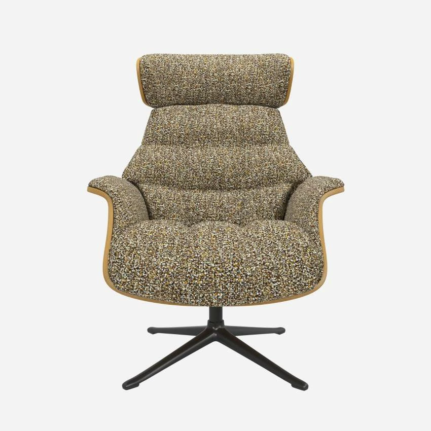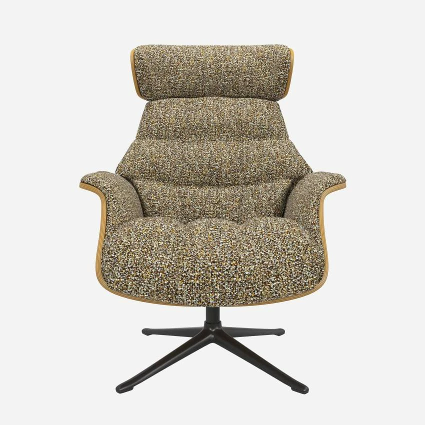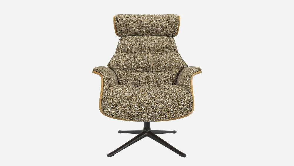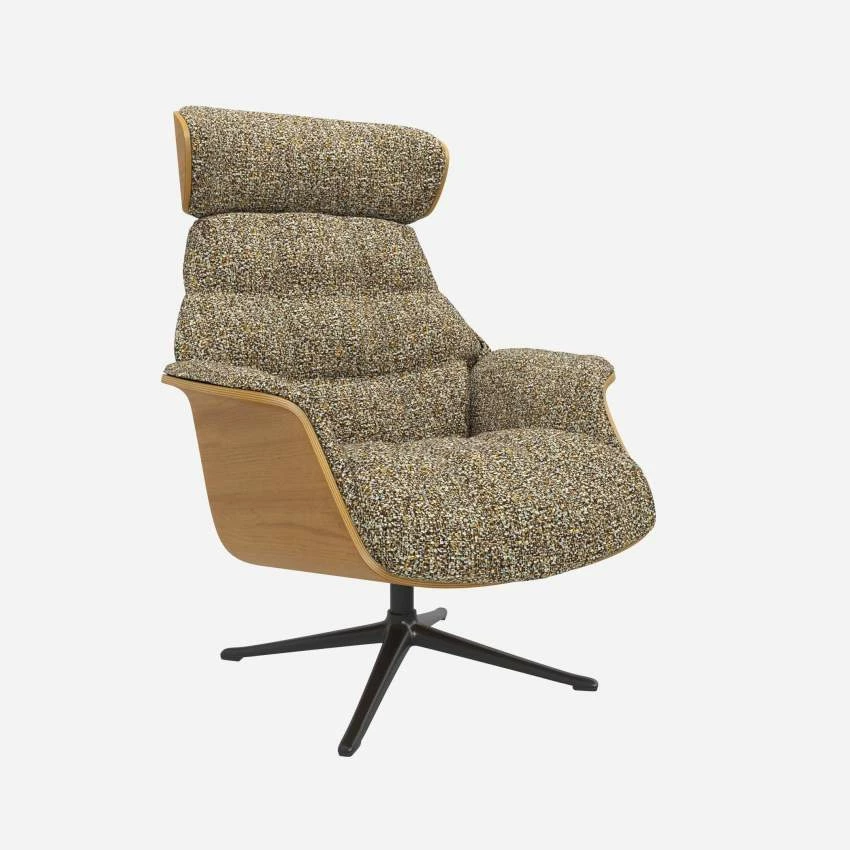 Le fauteuil Marc en chêne et tissu Venezia vert lichen avec pied noir offre un confort ultime, grâce à son dossier inclinable et à sa têtière ajustable en hauteur.