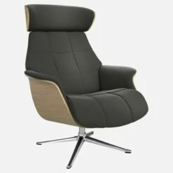 Le fauteuil Marc en chêne et velours gris ardoise avec pied aluminium offre un confort ultime, grâce à son dossier inclinable et à sa têtière ajustable en hauteur.