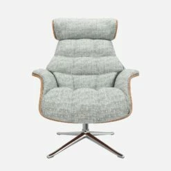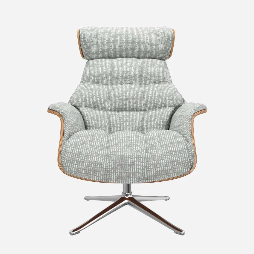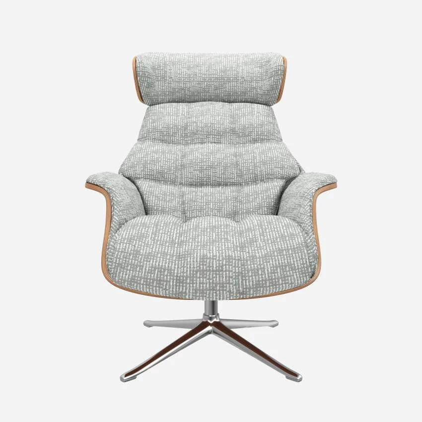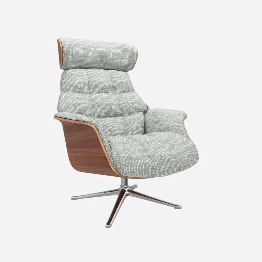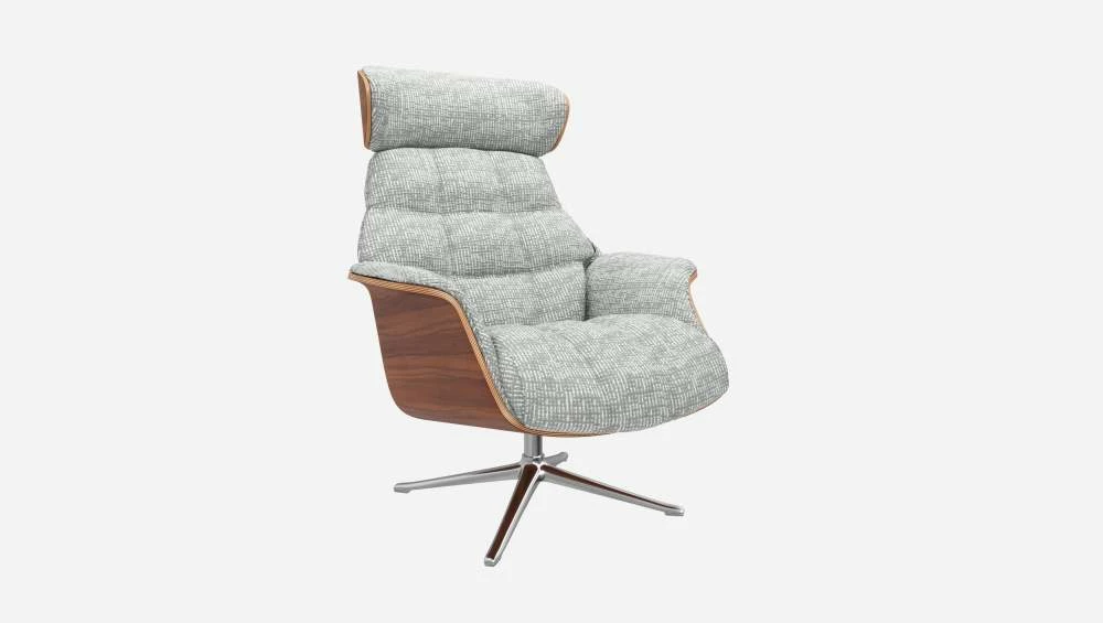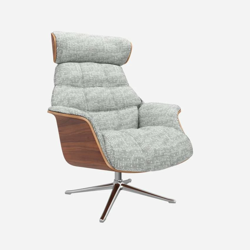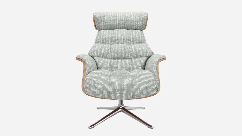 Le fauteuil Marc en noyer et tissu Alba gris brume avec pied aluminium offre un confort ultime, grâce à son dossier inclinable et à sa têtière ajustable en hauteur.