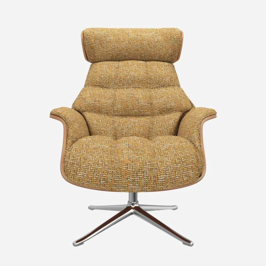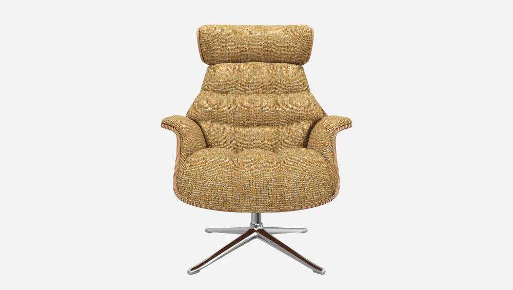 Le fauteuil Marc en noyer et tissu Alba jaune soleil avec pied aluminium offre un confort ultime, grâce à son dossier inclinable et à sa têtière ajustable en hauteur.
