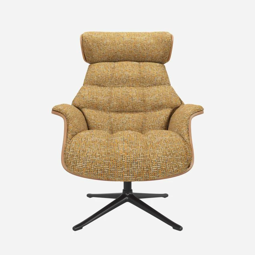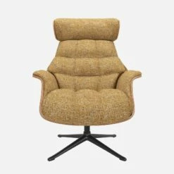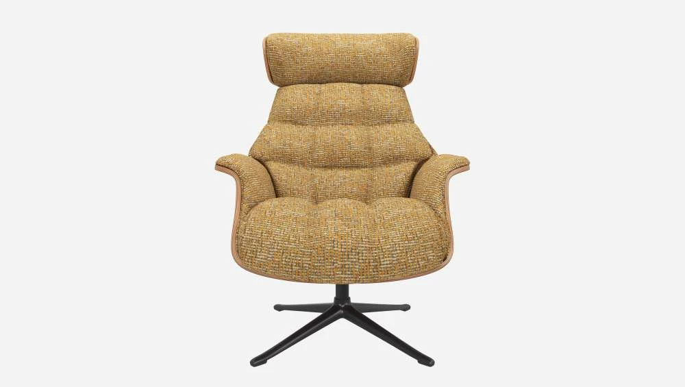 Le fauteuil Marc en noyer et tissu Alba jaune soleil avec pied noir offre un confort ultime, grâce à son dossier inclinable et à sa têtière ajustable en hauteur.