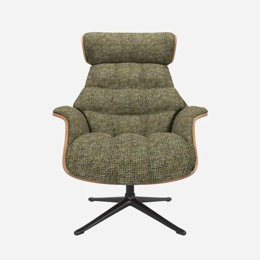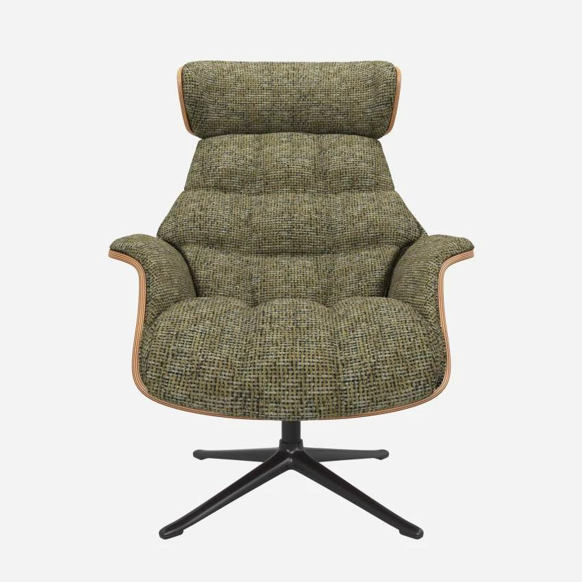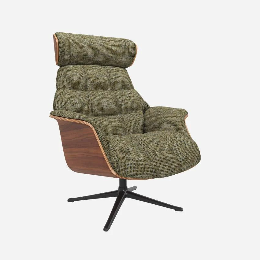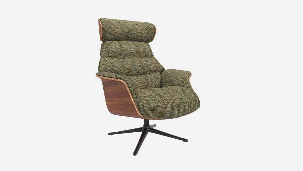 Le fauteuil Marc en noyer et tissu Alba vert orage avec pied noir offre un confort ultime, grâce à son dossier inclinable et à sa têtière ajustable en hauteur.