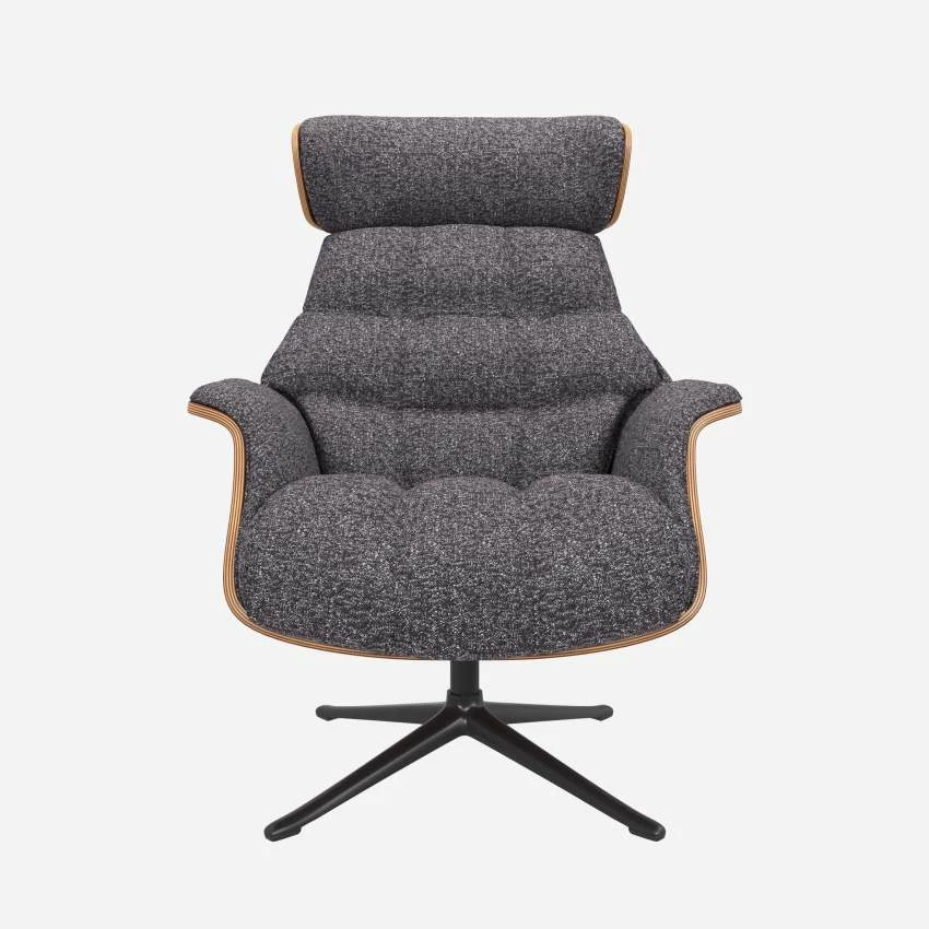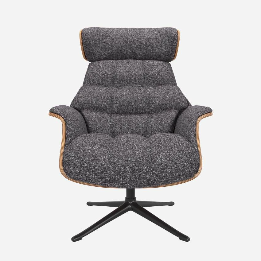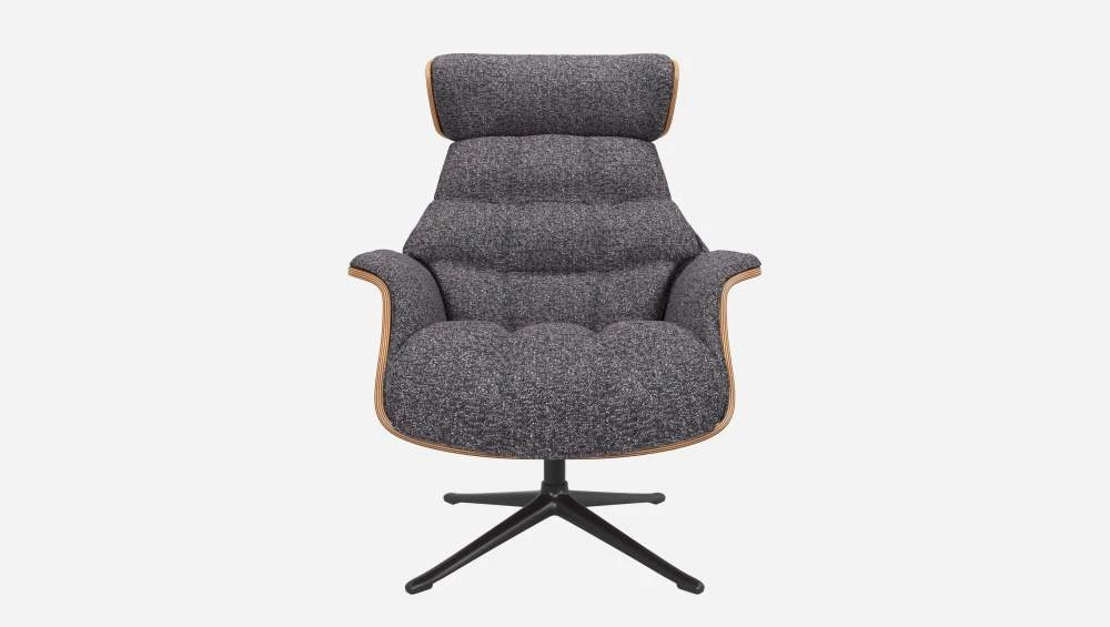 Le fauteuil Marc en noyer et tissu Lucca bleu zingué avec pied noir offre un confort ultime, grâce à son dossier inclinable et à sa têtière ajustable en hauteur.