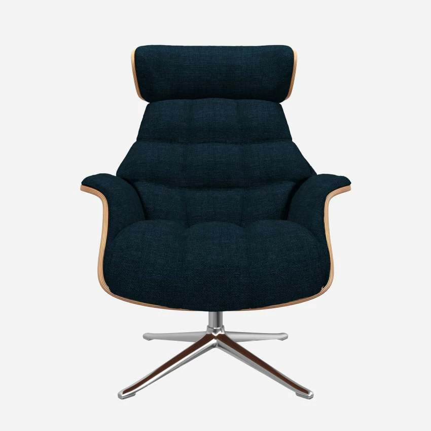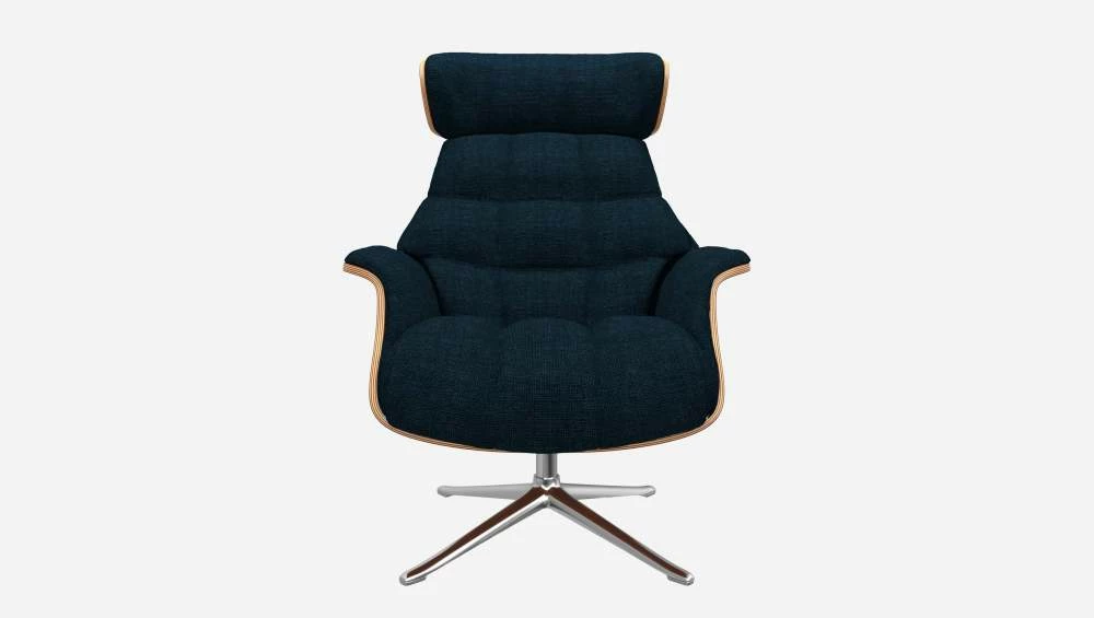 Le fauteuil Marc en noyer et tissu Melina bleu encre avec pied aluminium offre un confort ultime, grâce à son dossier inclinable et à sa têtière ajustable en hauteur.
