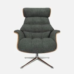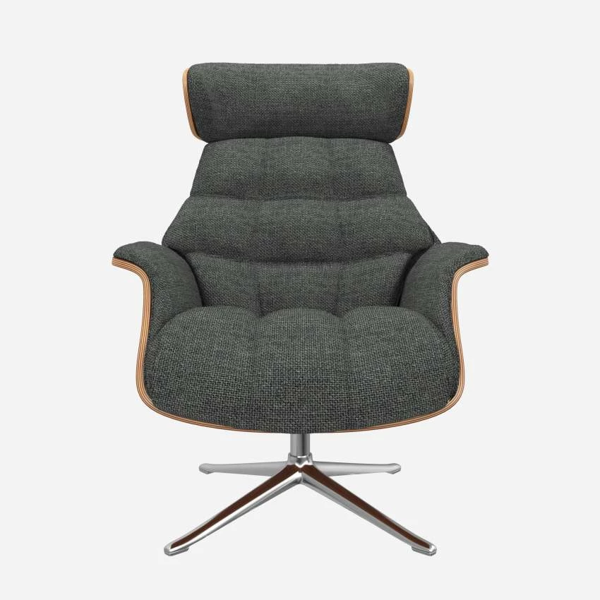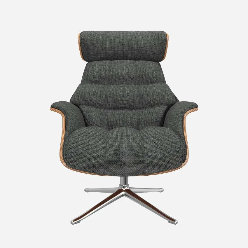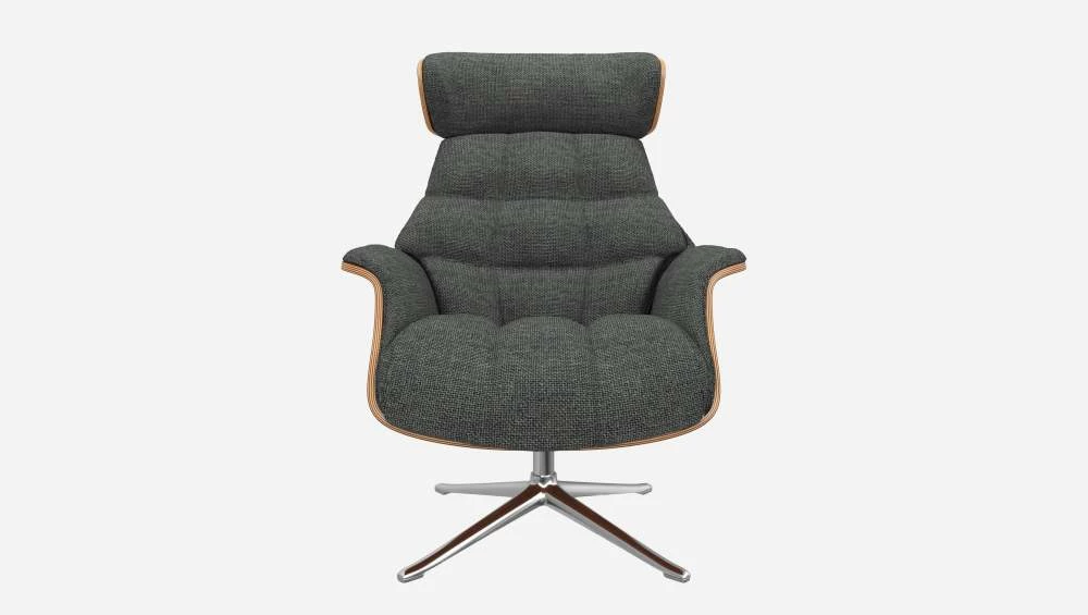 Le fauteuil Marc en noyer et tissu Melina gris ardoise avec pied aluminium offre un confort ultime, grâce à son dossier inclinable et à sa têtière ajustable en hauteur.