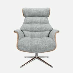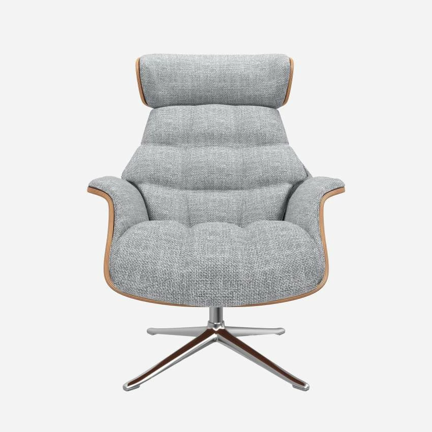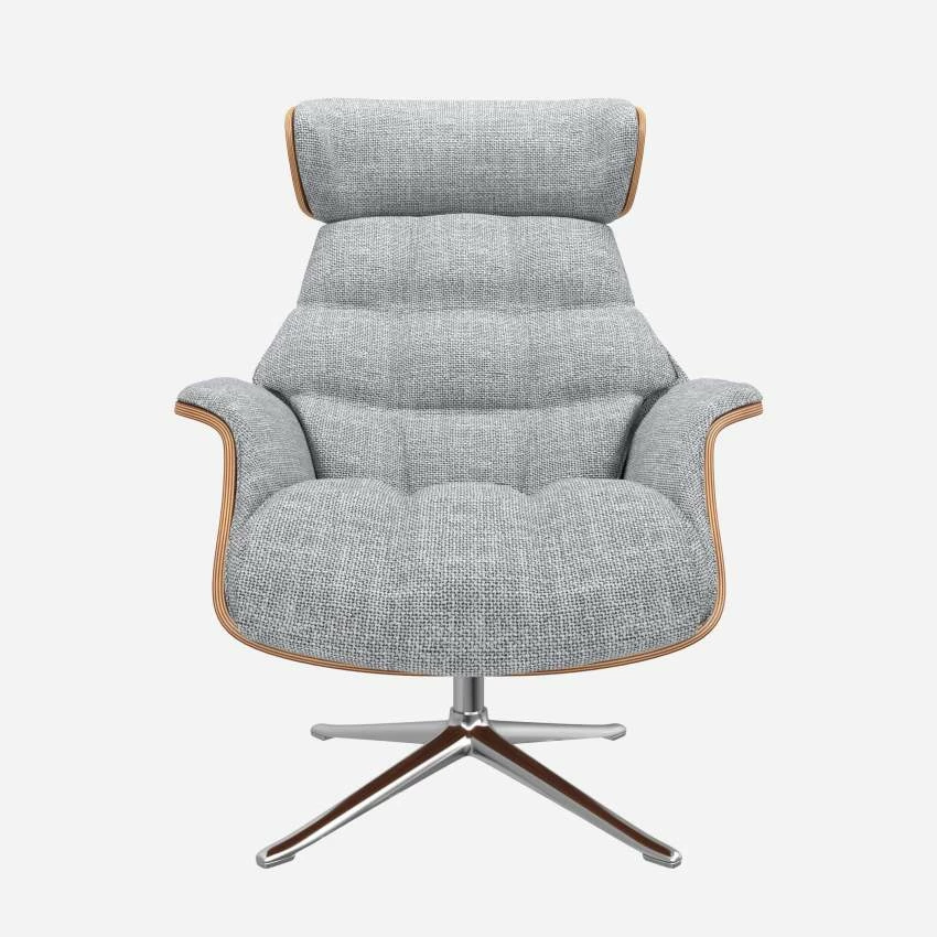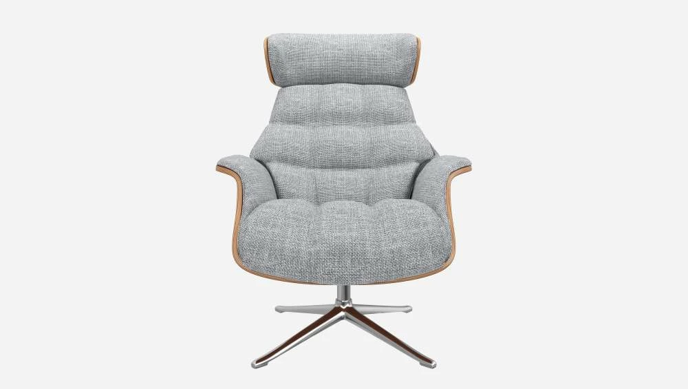 Le fauteuil Marc en noyer et tissu Melina gris asphalte avec pied aluminium offre un confort ultime, grâce à son dossier inclinable et à sa têtière ajustable en hauteur.