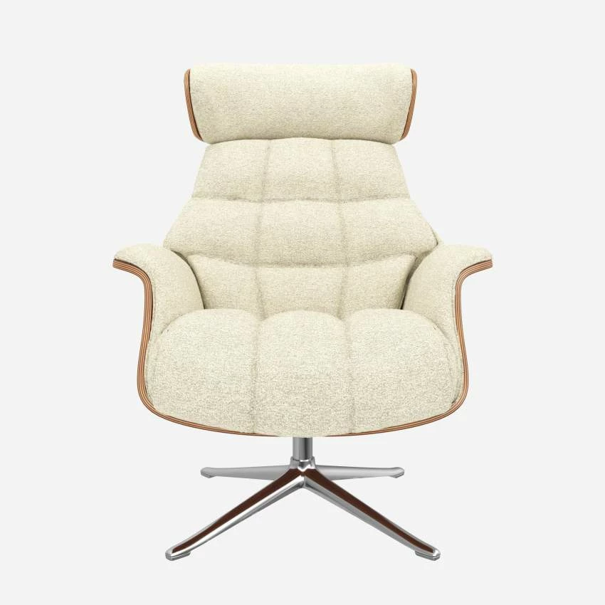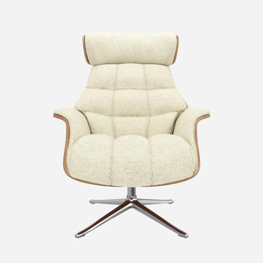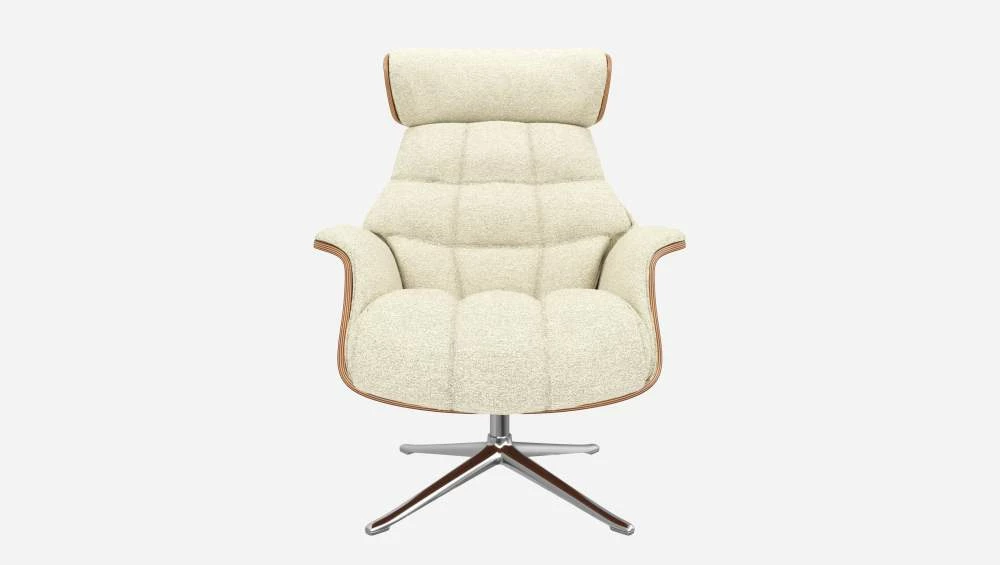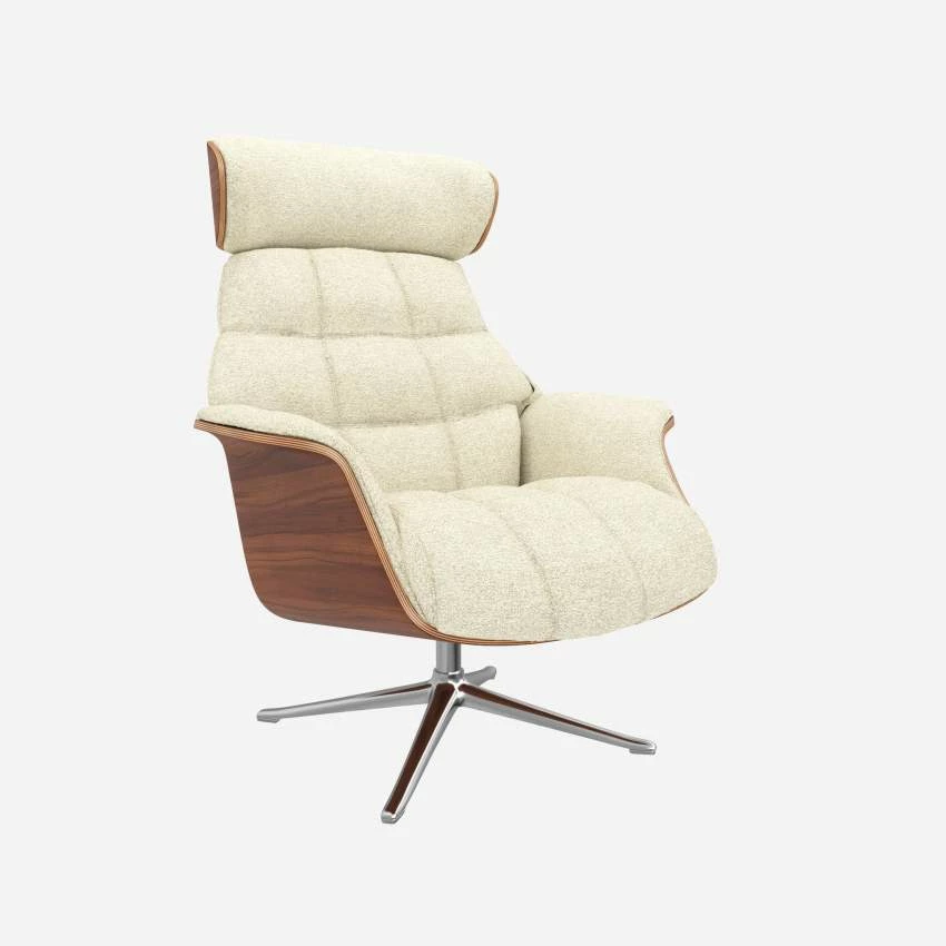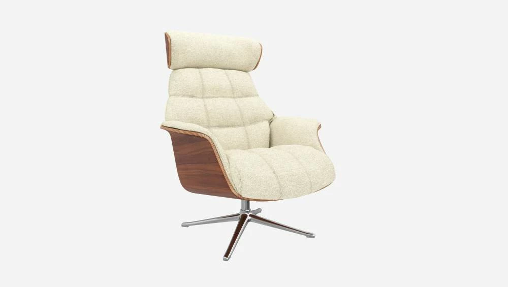 Le fauteuil Marc en noyer et tissu Venezia blanc craie avec pied aluminium offre un confort ultime, grâce à son dossier inclinable et à sa têtière ajustable en hauteur.