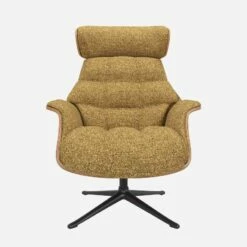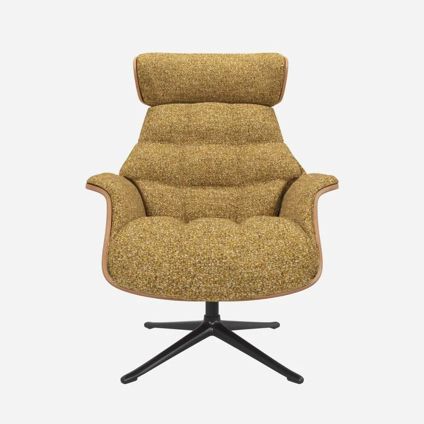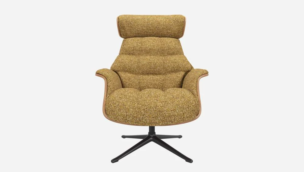 Le fauteuil Marc en noyer et tissu Venezia jaune épice avec pied noir offre un confort ultime, grâce à son dossier inclinable et à sa têtière ajustable en hauteur.