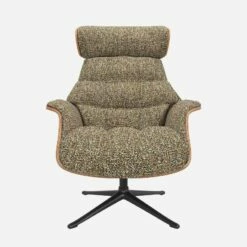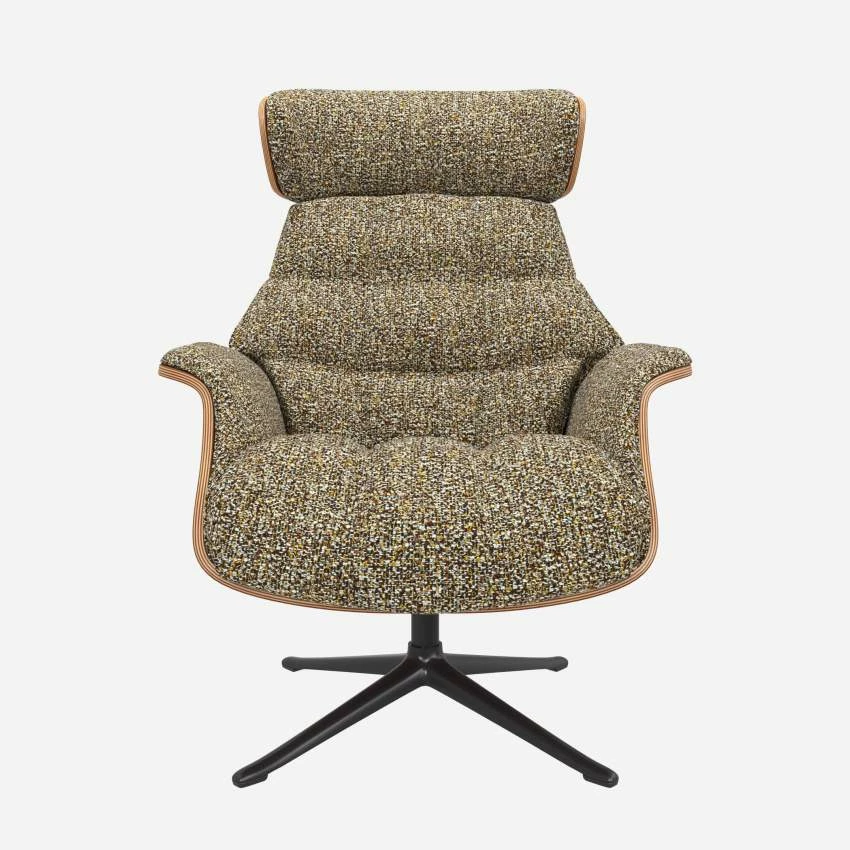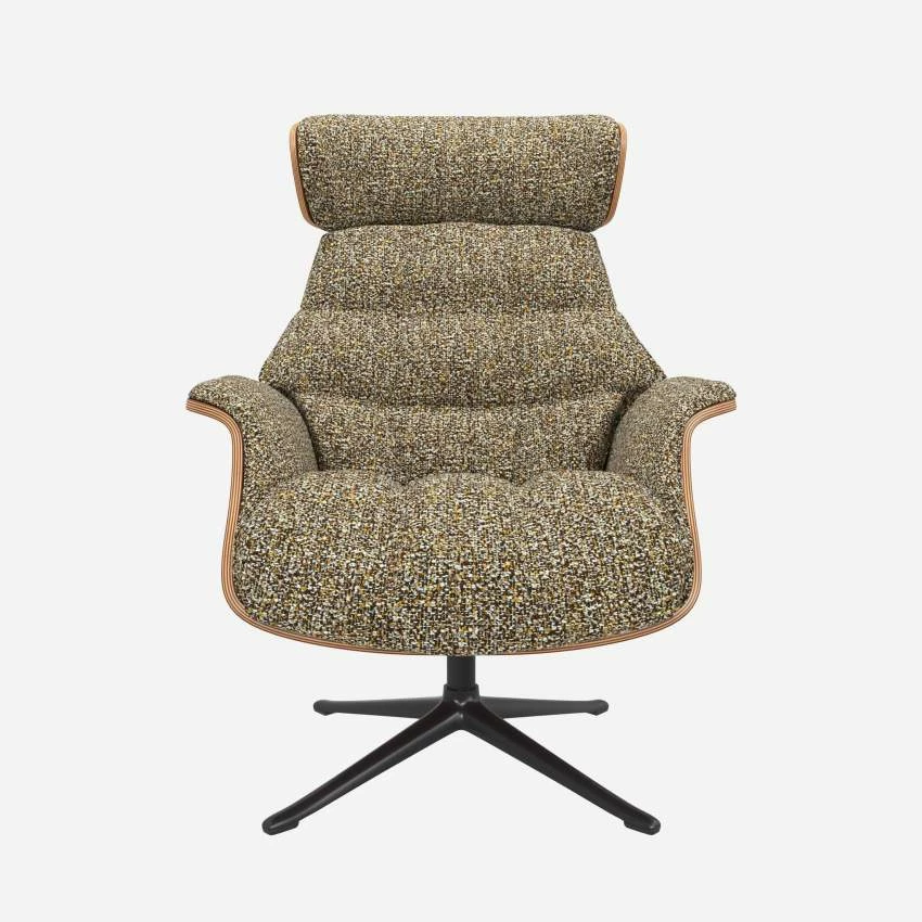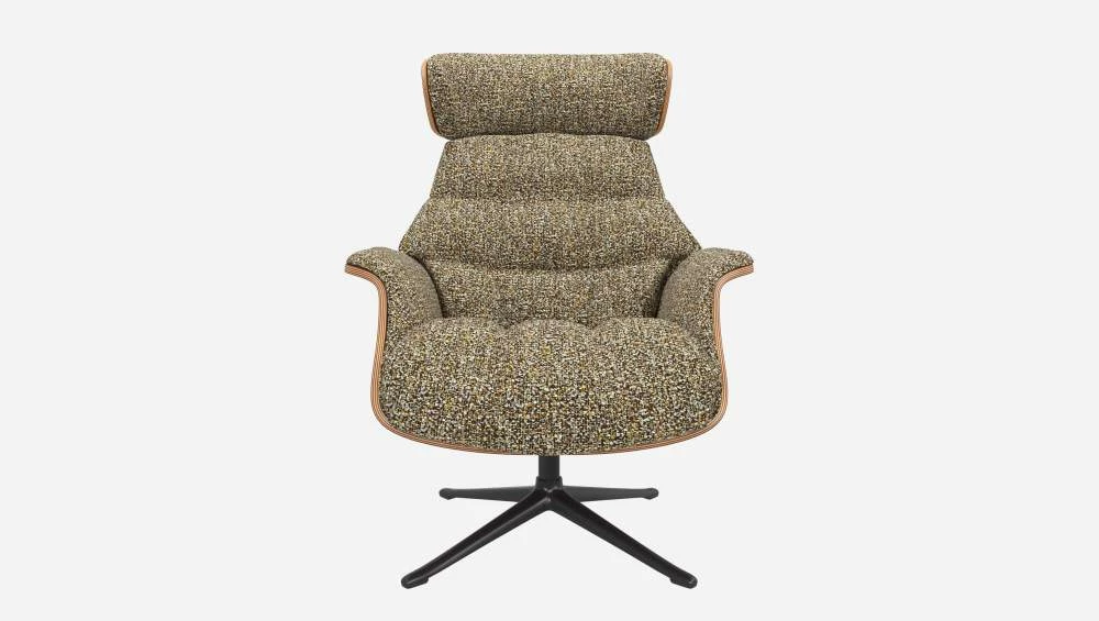 Le fauteuil Marc en noyer et tissu Venezia vert lichen avec pied noir offre un confort ultime, grâce à son dossier inclinable et à sa têtière ajustable en hauteur.