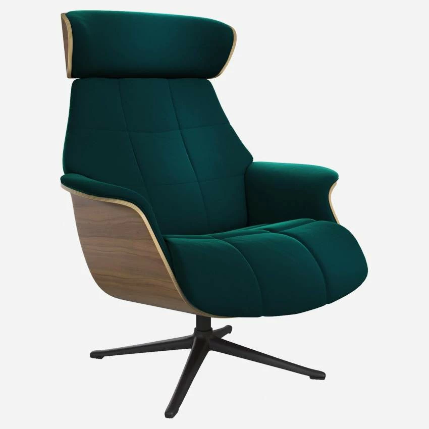 Le fauteuil Marc en noyer et velours vert émeraude avec pied noir offre un confort ultime, grâce à son dossier inclinable et à sa têtière ajustable en hauteur.