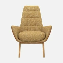 Le fauteuil Dena en tissu Alba jaune soleil et cuir Vintage avec pieds chêne invite au repos et à la détente. Son design arbore des courbes enveloppantes. Il possède un dossier haut et matelassé. Ce dernier est composé d’un mélange de mousse et de plumes. Très confortable, ce fauteuil design est parfait pour les instants de lecture.