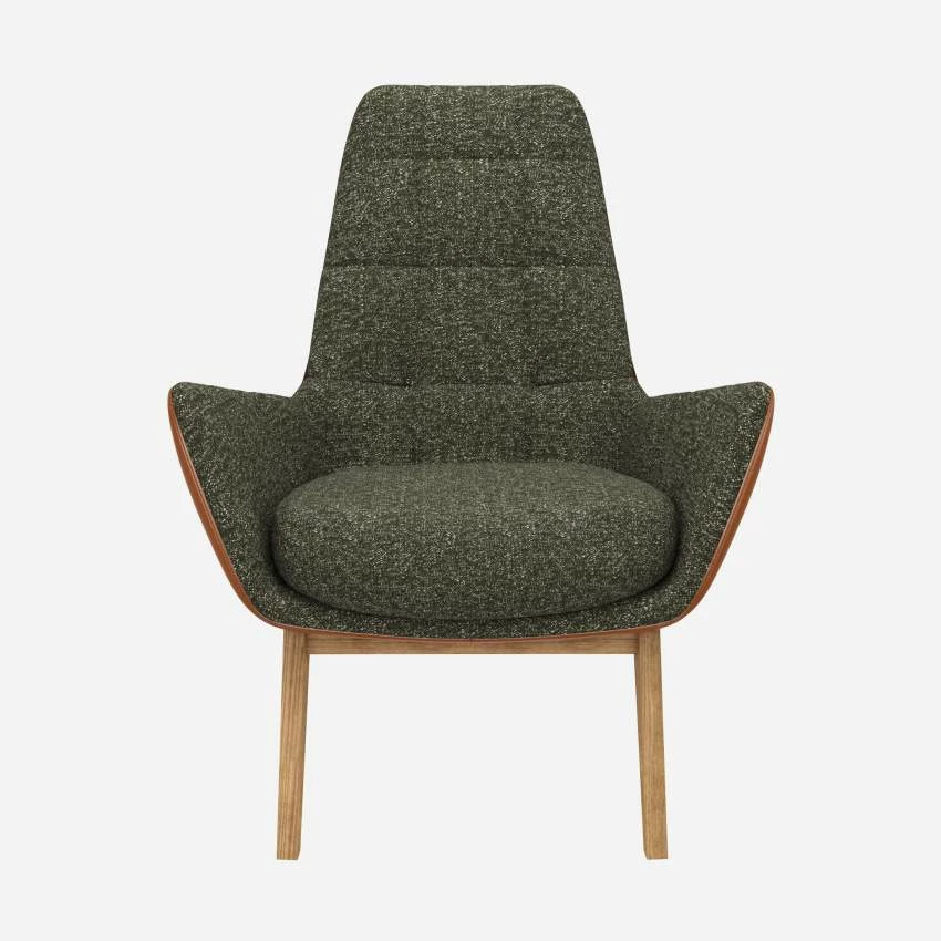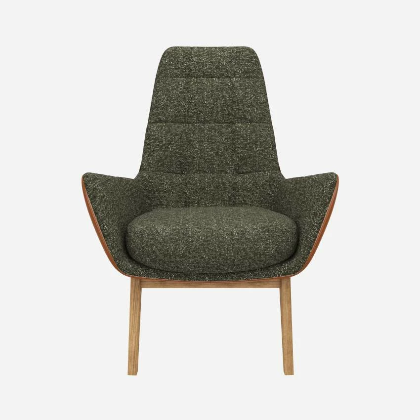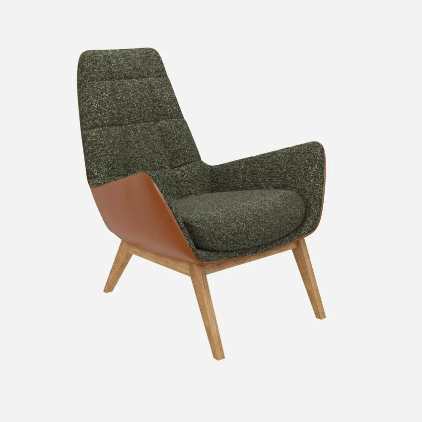 Le fauteuil Dena en tissu Lucca vert mousse et cuir Vintage avec pieds chêne invite au repos et à la détente. Son design arbore des courbes enveloppantes. Il possède un dossier haut et matelassé. Ce dernier est composé d’un mélange de mousse et de plumes. Très confortable, ce fauteuil design est parfait pour les instants de lecture.