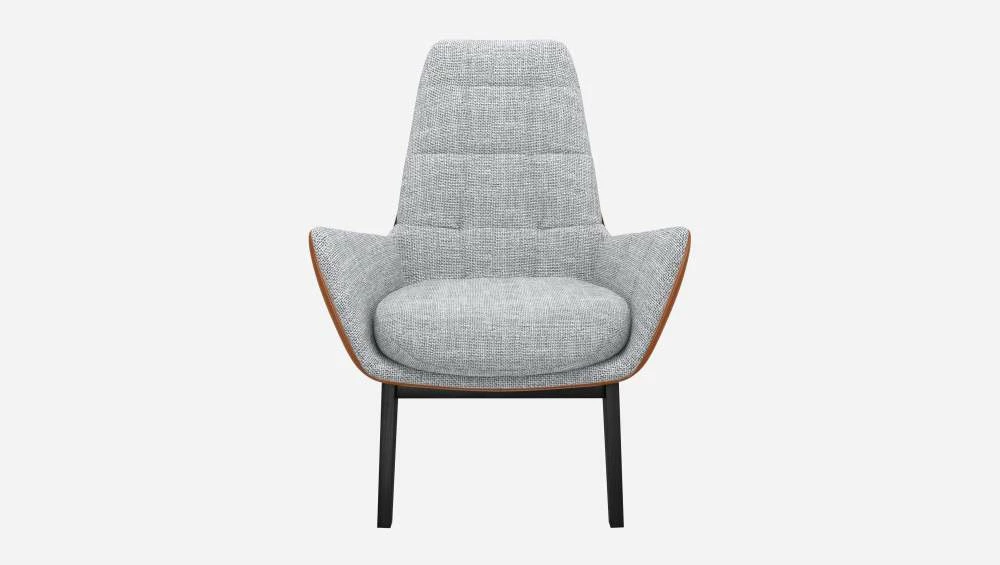Le fauteuil en tissu Melina gris asphalte et cuir Vintage avec pieds noirs peut être associé avec le repose-pieds de la même collection.