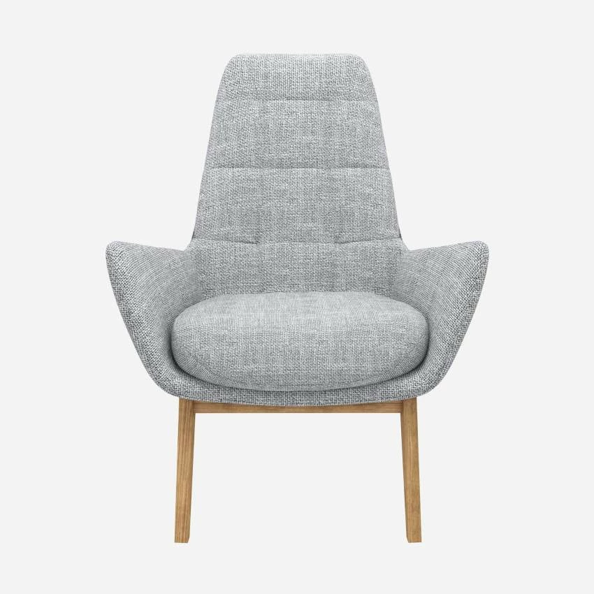 Le fauteuil en tissu Melina gris asphalte avec pieds chêne peut être associé avec le repose-pieds de la même collection.