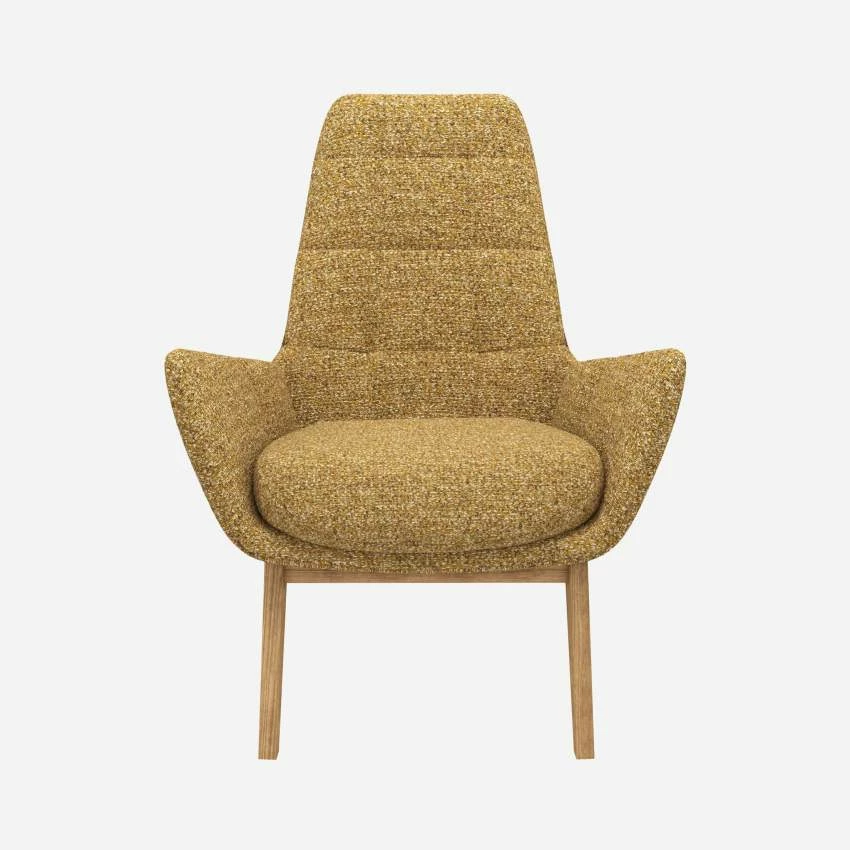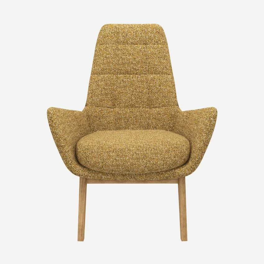 Le fauteuil en tissu Venezia jaune épice avec pieds chêne peut être associé avec le repose-pieds de la même collection.