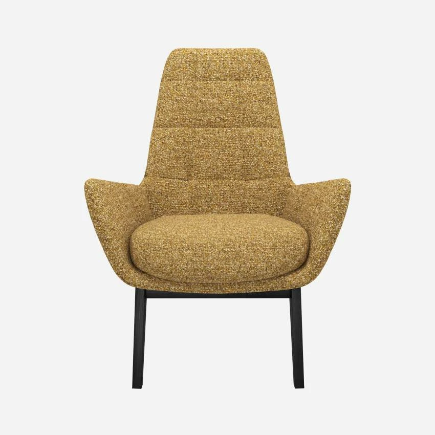 Le fauteuil en tissu Venezia jaune épice avec pieds noirs peut être associé avec le repose-pieds de la même collection.