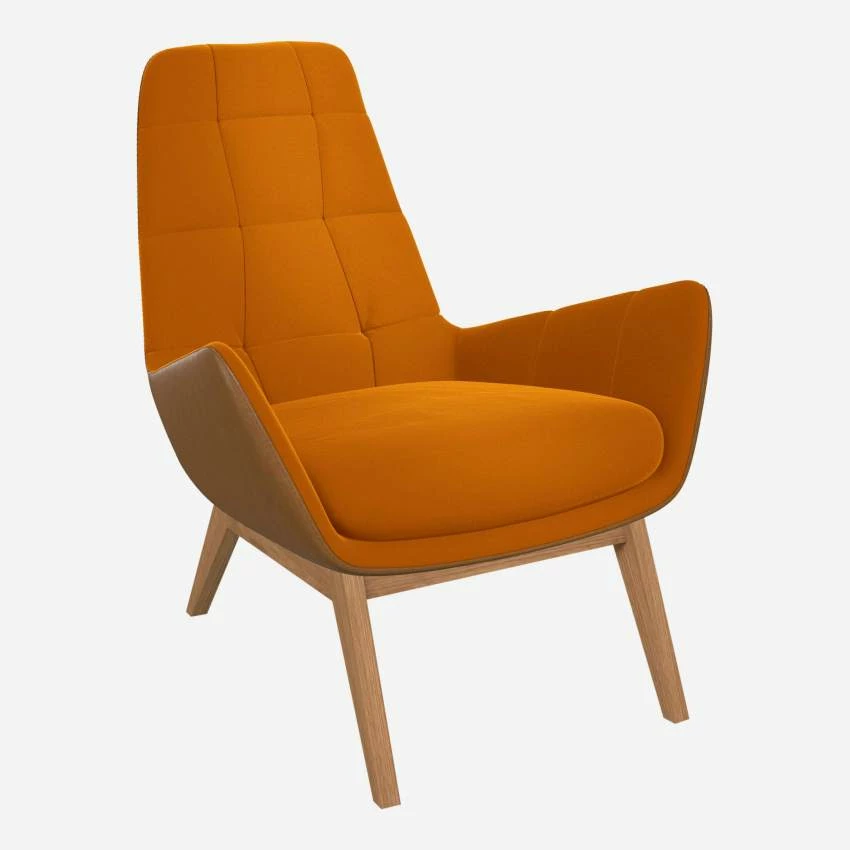 Le fauteuil Dena en velours jaune moutarde et cuir Vintage avec pieds chêne invite au repos et à la détente. Son design arbore des courbes enveloppantes. Il possède un dossier haut et matelassé. Cette assise profite d’un rembourrage en mousse haute résilience et d’un accueil composé d’un mélange de mousse et de plumes. Très confortable, ce fauteuil design est parfait pour les instants de lecture.