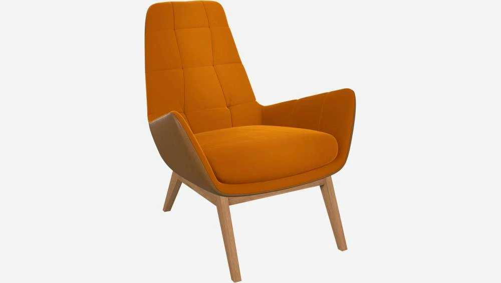 Habitat Fauteuil En Velours Jaune Moutarde Et Cuir Vintage – Pieds Chêne