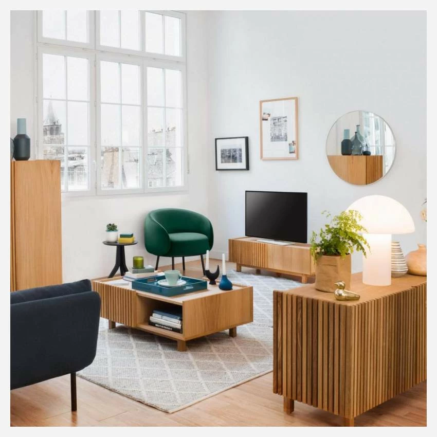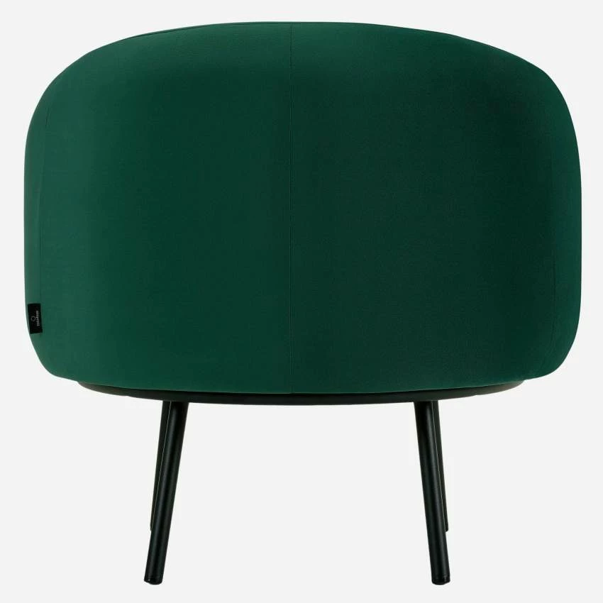 A la fois enveloppant et confortable, il associe rondeur et douceur. En velours vert, il repose sur un piètement noir en acier pour plus de stabilité.