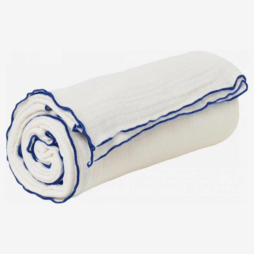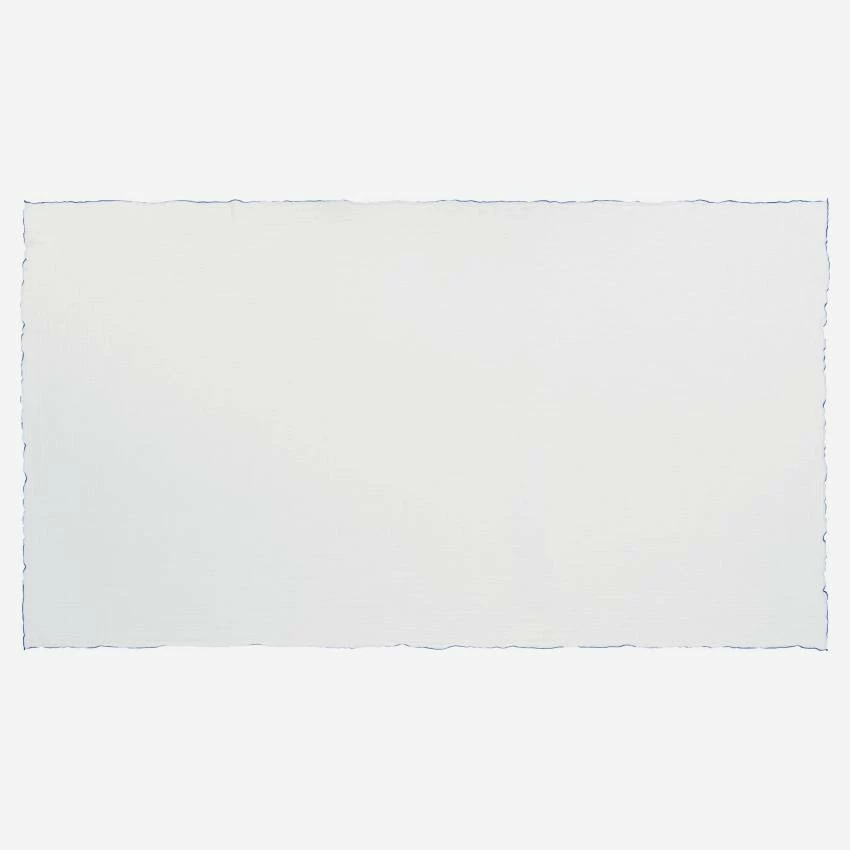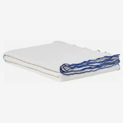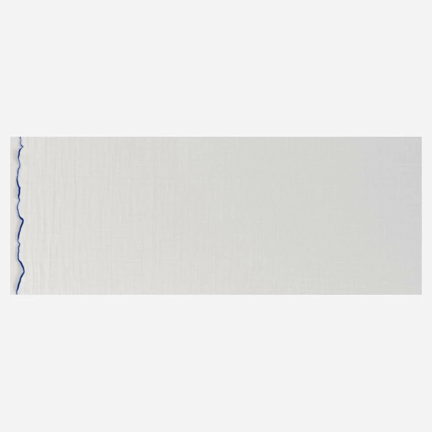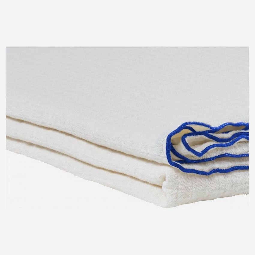 Sudeva est une fouta en gaze de coton de fabrication portugaise. De couleur blanche, elle est réhaussée d’un feston bleu.