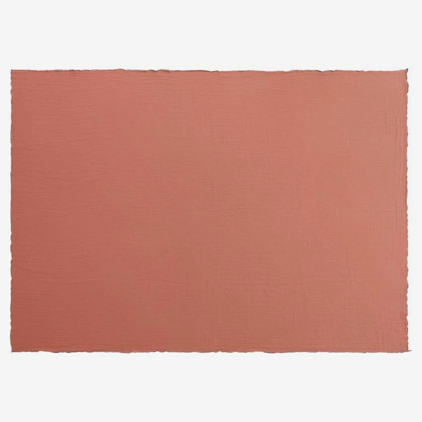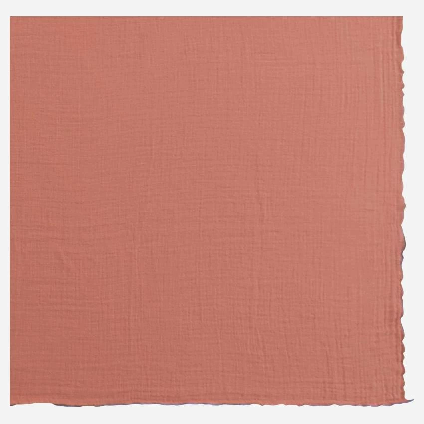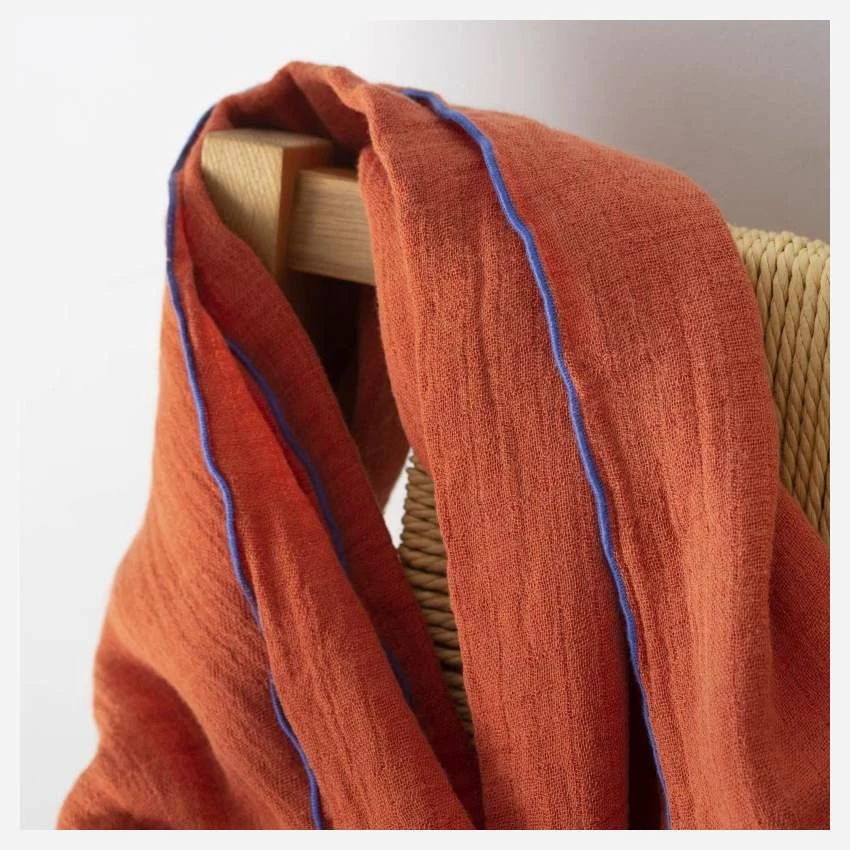 Sudeva est une fouta en gaze de coton de fabrication portugaise. De couleur terracotta, elle est rĂ©haussĂ©e d’un feston bleu.