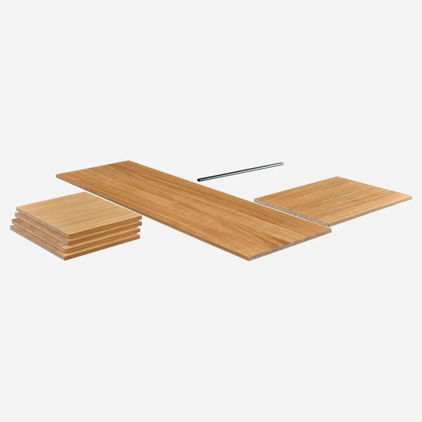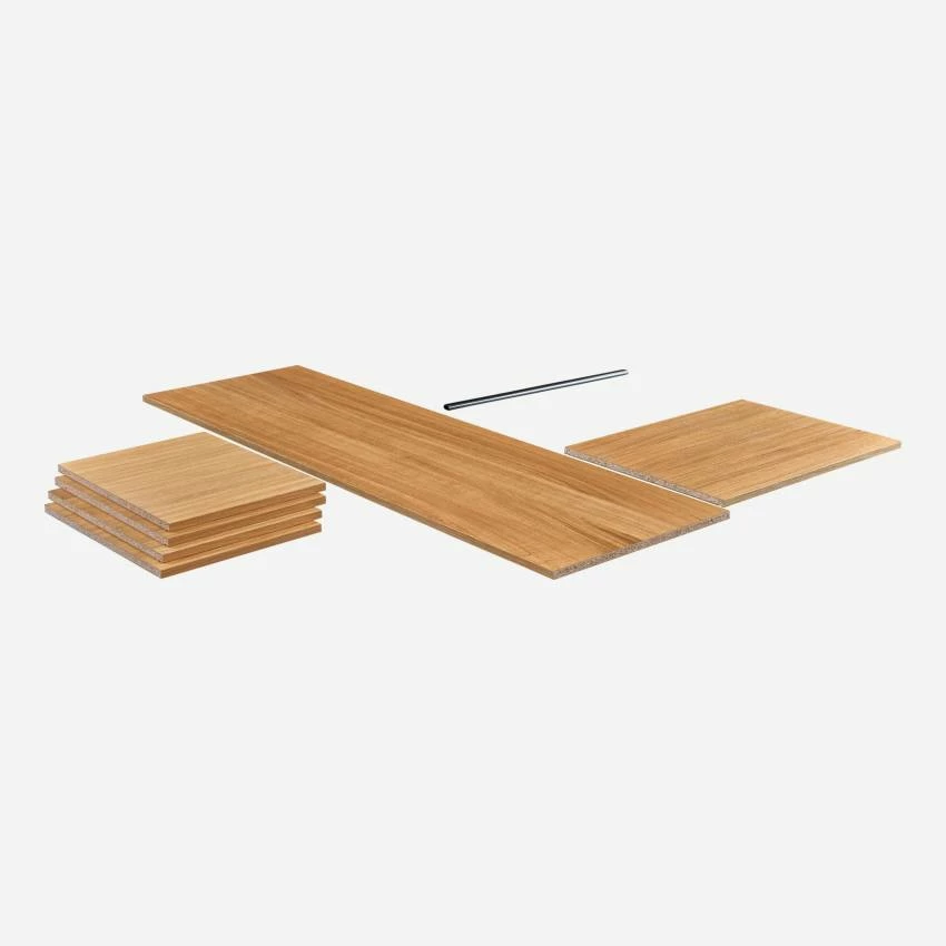 Kit armoire comprenant :4 étagères plaquées chêne et 1 barre de penderie chromée. Compatible uniquement avec l’armoire Radus 2 portes (vendue séparément) . Poids : 18 kg.