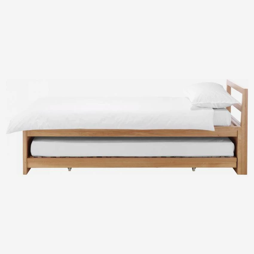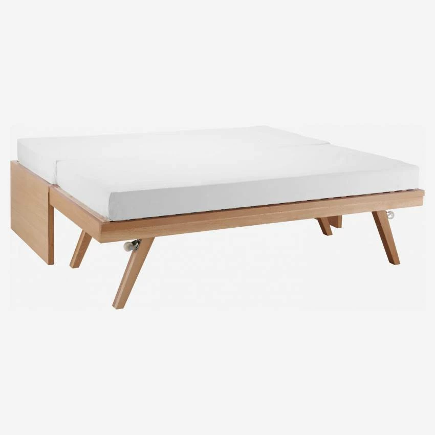 Ce lit très fonctionnel, fabriqué en chêne et pin, répondra parfaitement à vos besoins. Idéal pour les enfants ou les amis, ce lit 1 place possède un deuxième lit monté sur roulettes, avec pieds repliables. Ce second couchage pourra très facilement se transformer en un grand lit 2 places. Matelas et linge de lit vendus séparément.