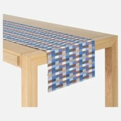 Les travers de table en coton de 140 x 40 cm affichent un motif composé de rectangles bleus et beiges.