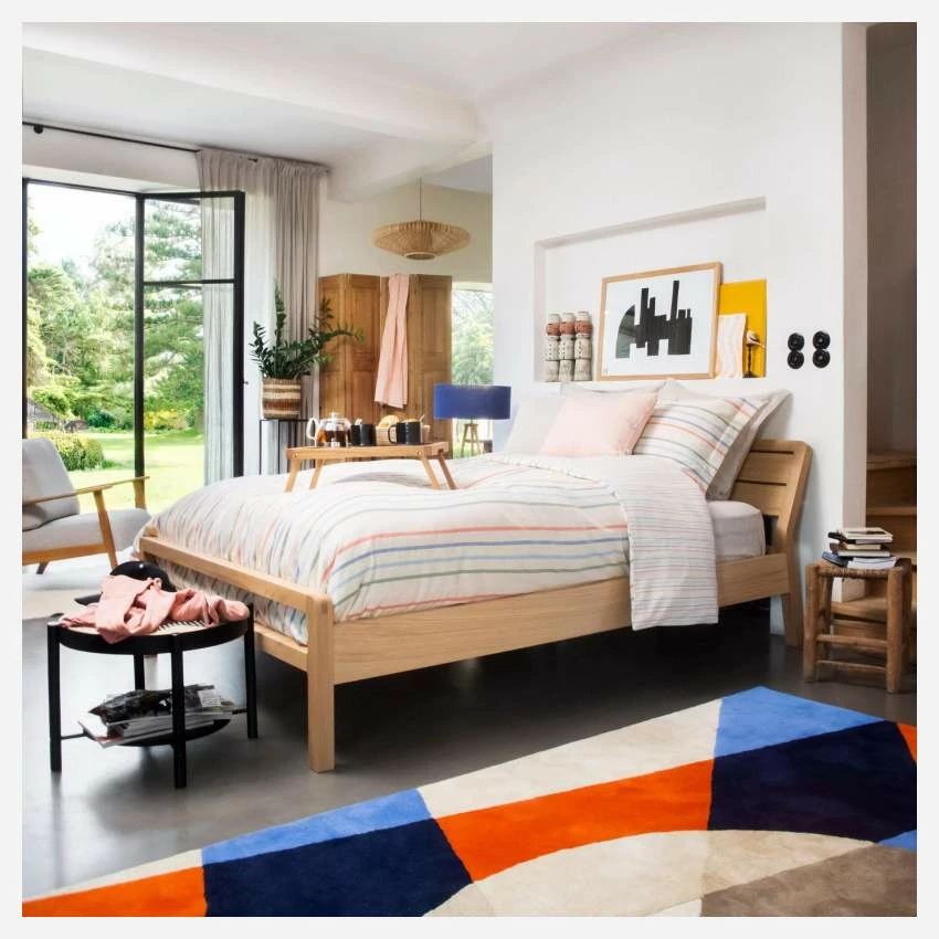 La parure de lit Ullabeth est en 100% coton et de fabrication portugaise. Elle se compose d’une housse de couette de 240 x 260 cm et de 2 taies d’oreiller de 65 x 65 cm.