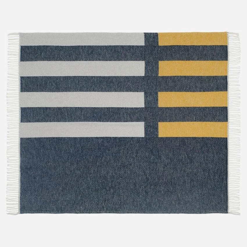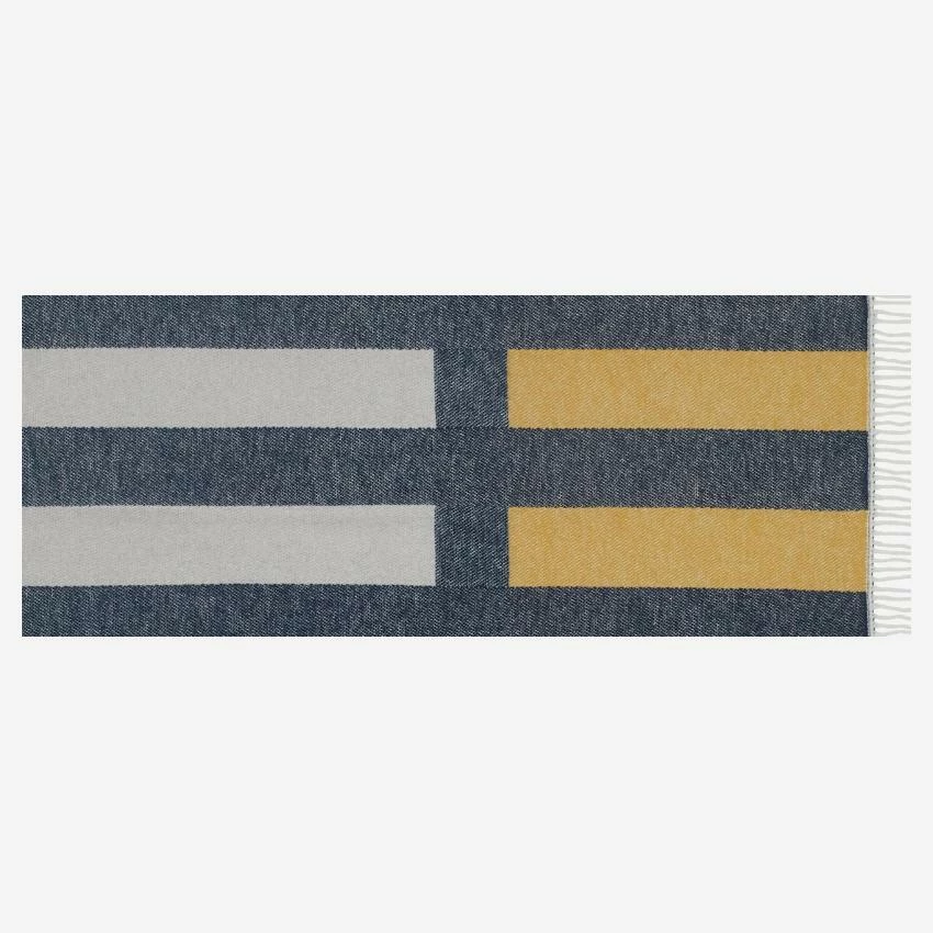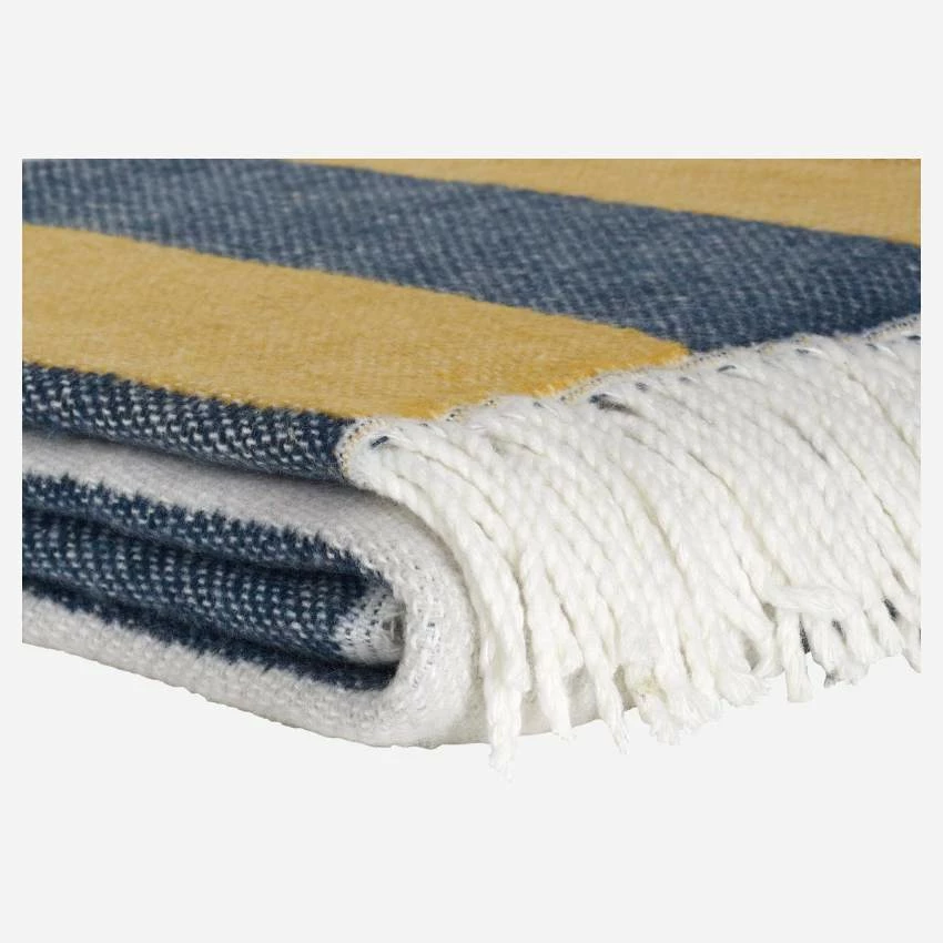 Le plaid Prune de couleur bleu marine et jaune moutarde est en coton gratté et fibres acrylique. Très doux au toucher, il mesure 130 x 170 cm.